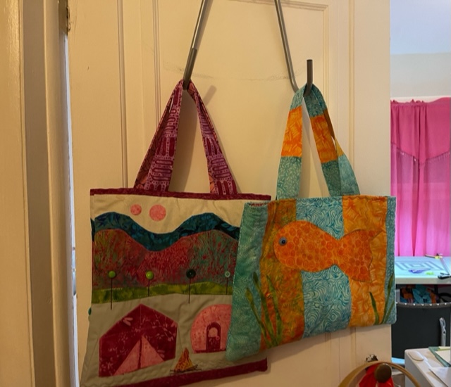 The Accuquilt Camper die was so adorable! I selected a dark and light pink to layer in my first cut of the Accuquilt Camper die. Each dark and light camper window, door and axle pieces were switched rather than take more cuts with white and black fabrics. Buttons were used to embellish each tote–so much fun! I also used applique techniques –my Brother Dreamweaver is a master for my design embellishments. For the camper tote I added a tent, campfire, fun trees and of course, a pocket inside. The Island Batik fabrics used were blenders and absolutely fit the project so well!! Loads of fun and cannot wait to use my Accuquilt Go again!