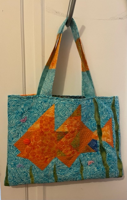 Prior to starting, I cleaned my Brother Dreamweaver bobbin housing and changed the Schmetz needle. I started on the cute fish tote pattern I found at the Accuquilt website while I waited for the Camper die to come. I tend to make changes to patterns to suit my preferences. So I did use some artistic license on the Accuquilt tote pattern. I opted to make each tote double sided. The fish tote pattern was so cute but I did get a little turned around on the numbering of pieces coupled with the fact I wanted my fish to be an all orange fish. One side of the tote was the fish using Accuquilt 8 inch Mix and Match pieces and the other side was a free form applique of my own design. I used some mini fish buttons from my huge button stash and free form pieces of Island Batik Glorious Green as seaweed for fun additions to the design.