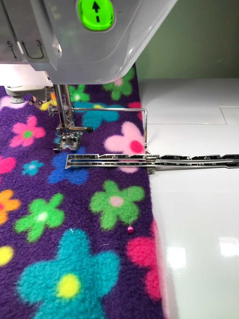 You may want to add a fussy cut of the coordinating for fun. Pick your favorite and center on the front of your choice. Decorative stitch around the edge of that fussy cut. Once your collar and fussy cut is in place proceed to put right sides together of your two fleece oblongs ensuring the front slits align and the collar lays between the right sides. Sew slowly between all 4 layers all around the neck. Check all layers are aligned. Turn inside out when sewing is complete. Use decorative stitch starting at the back of the neck and following around the neck and down and up the edge of the slit staying away from the four layered seam. Lay flat on cutting table and pin around the oblong, smoothing the fleece toward the edge of the oblong as you go. Set your sewing guide bar to two inches as shown in the bottom left picture above. Sew around the bottom oblong at the two inch setting–I used a decorative stitch but that is optional. Lay flat again and at the bottom edge, cut slits up to a 1/4 inch of bottom oblong stitch all away around the bottom edge of the poncho. Take a one inch set of the top and bottom fleece and tie a knot, repeat all the way around.