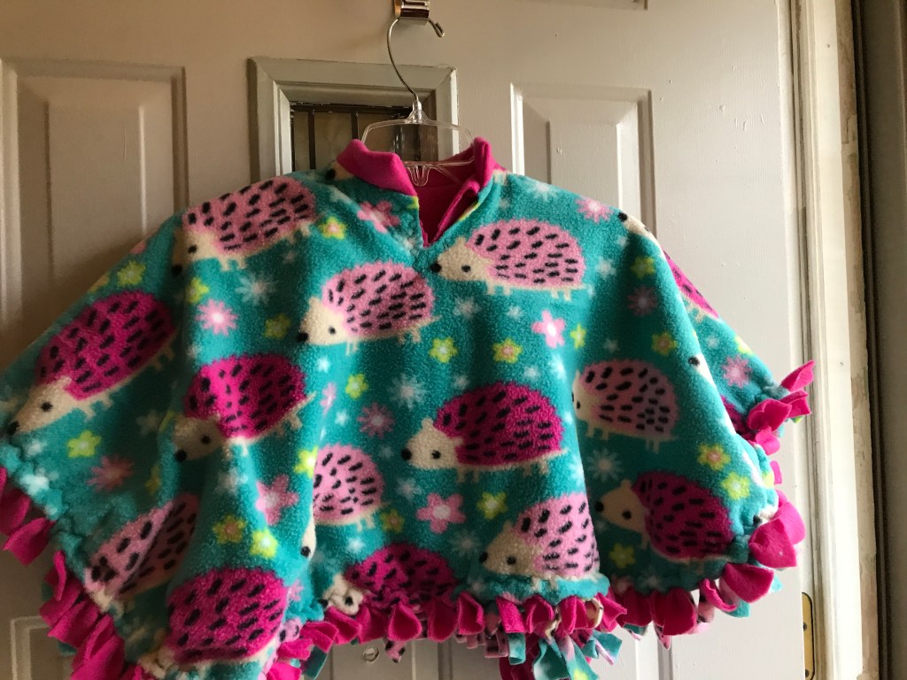 *Note: I came across a sale on fleece throw kits which gave me enough fabric to make two ponchos for half the price 2 yards would have cost. Also look in the remnant bins for possibilities:)