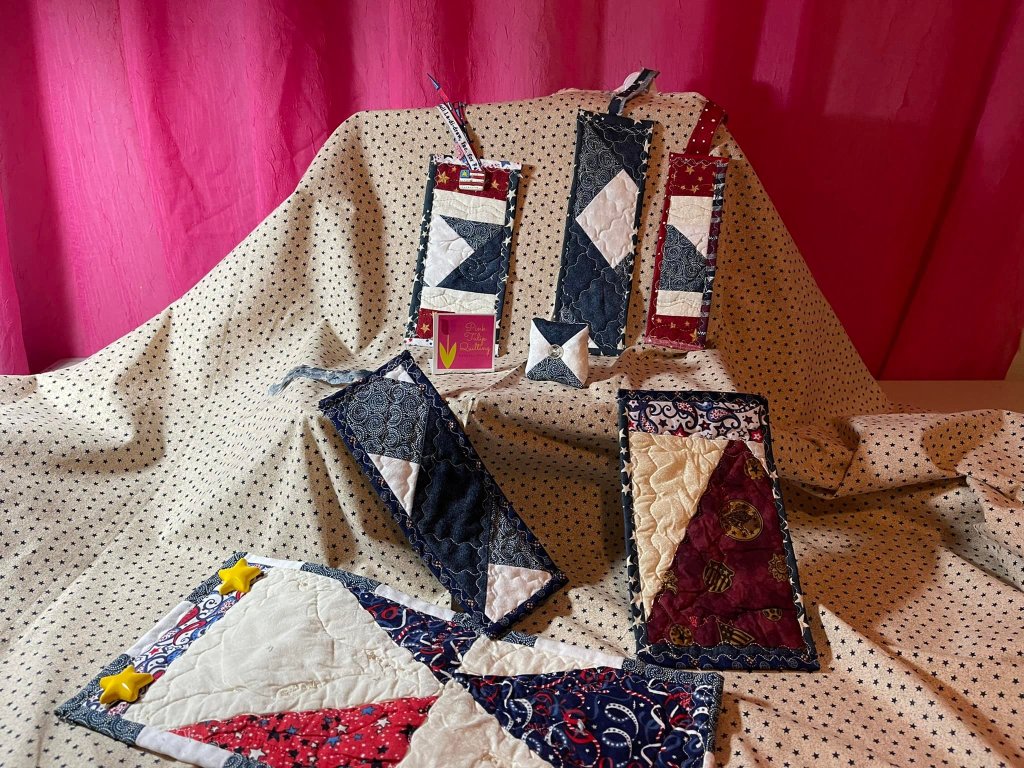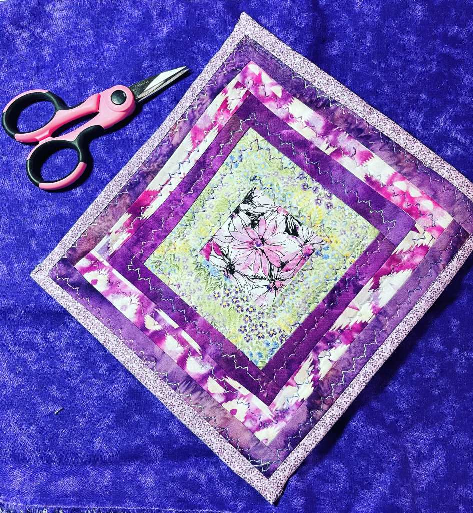 Chaisson’s mini-Dresden plate blocks, mini fabric stamps or charms, micro quilts, and custom pins are precious! I am amazed at her work with tiny scraps of fabric and understand the talent behind it! In May of 2022, I participated in her Micro Mini Sew Along (SAL) and was surprised to win the color block challenge with my mini quilt in purple.