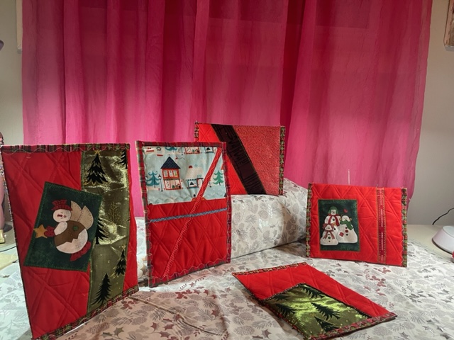 Mug rugs were so fun to make and great gifts! I kept a variety of colors and sizes on my kitchen counter to give away to people who stopped by or when I went to visit my hairdresser, PT staff and grocery delivery. I made about 20, all different sizes and colors; all from my scrap Christmas fabric collection!