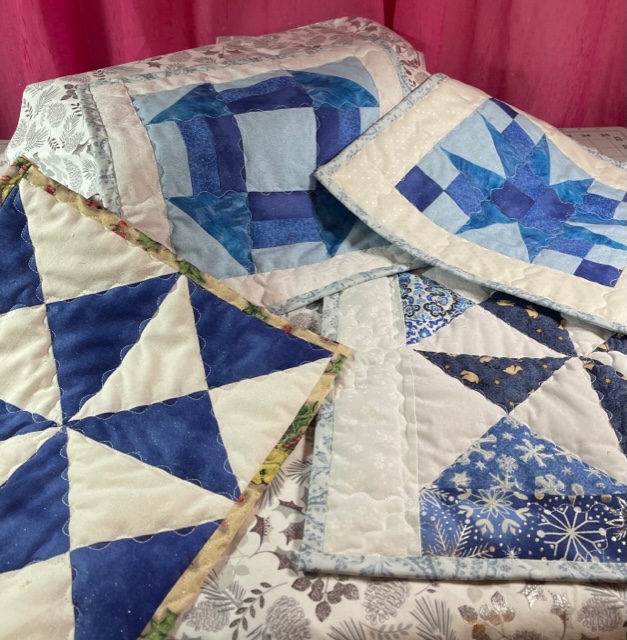 i was fortunate to have a few blue and white fully pieced squares left over from other projects and also pre-cut six-inch fabric squares in blue and white. JoAnns’ staff had told me blue and white was very popular for the Holidays! So I compiled those squares picking a blue backing for some and Christmas backing for others. All were reversible but the blue backed could be used past the holidays. Pick your favorite square combinations and sew! There were approximately 10 inches square to easily accommodate a mug and small plate of biscotti.
