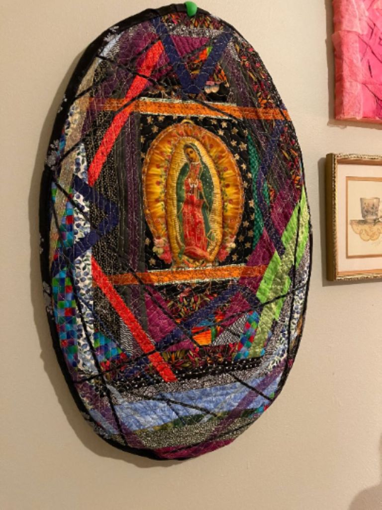 As I used a variety of ribbon and fabric, a variety of threads were used for the stitching /quilting. I have a passion for variegated thread use in fabric collage. Metallic threads provide the bit of glimmer I also love. This piece was so much fun to construct, and I honestly did not know the ultimate final shape as I worked. I had a 32-inch quilt shape with wonky edges and stepped back to determine my decision to move forward. I decided since the Madonna is used in medallions so often that I wanted an oval shape. I just happened to have a 25 inch oval embroidery hoop.