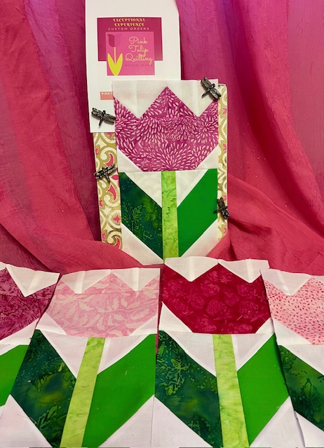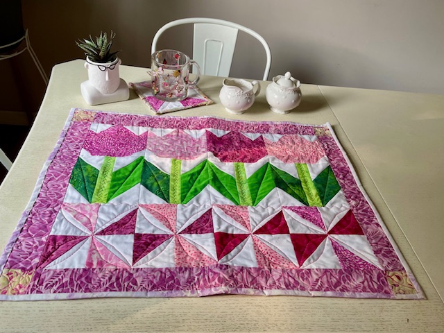 A miniature quilt is a wonderful way to explore a piecing or quilting technique or make a pattern without a huge investment in time and fabric. They are defined as small versions of full sized quilts and range in size between 12 to 24 inches on a side to being no larger than 24 inches square. Island Batik provided several resource links for quilt blocks and one was for tulips from Inspired by Fabric.