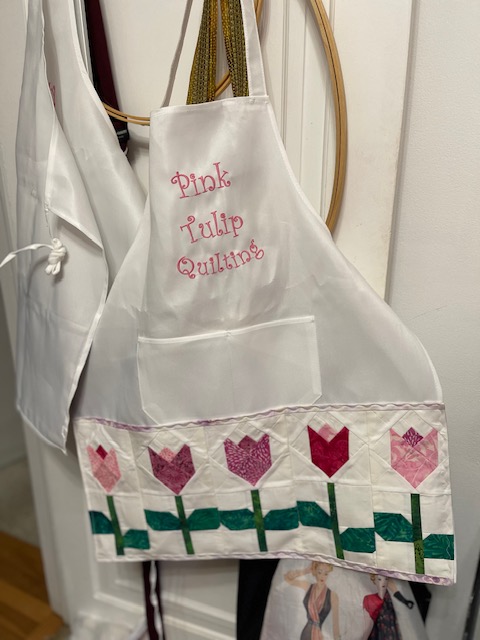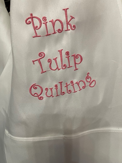 I wanted to make a companion to my mini quilt, and I needed a new Pink Tulip Quilting apron, so I used the tulip mini block from Podunk Pretties to embellish a white apron I had purchased on Amazon. I embroidered Pink Tulip Quilting on the apron with my Bernina 750.