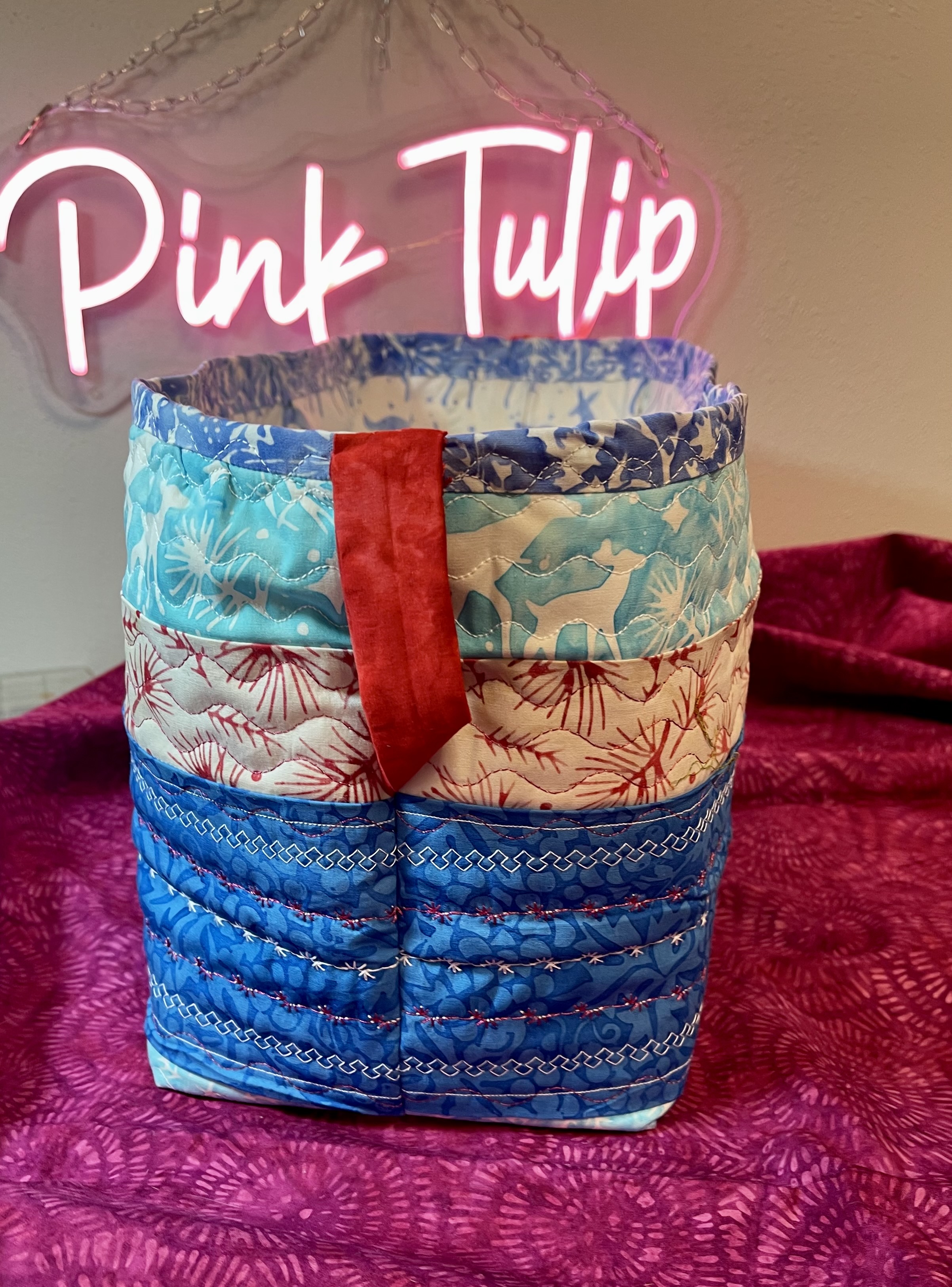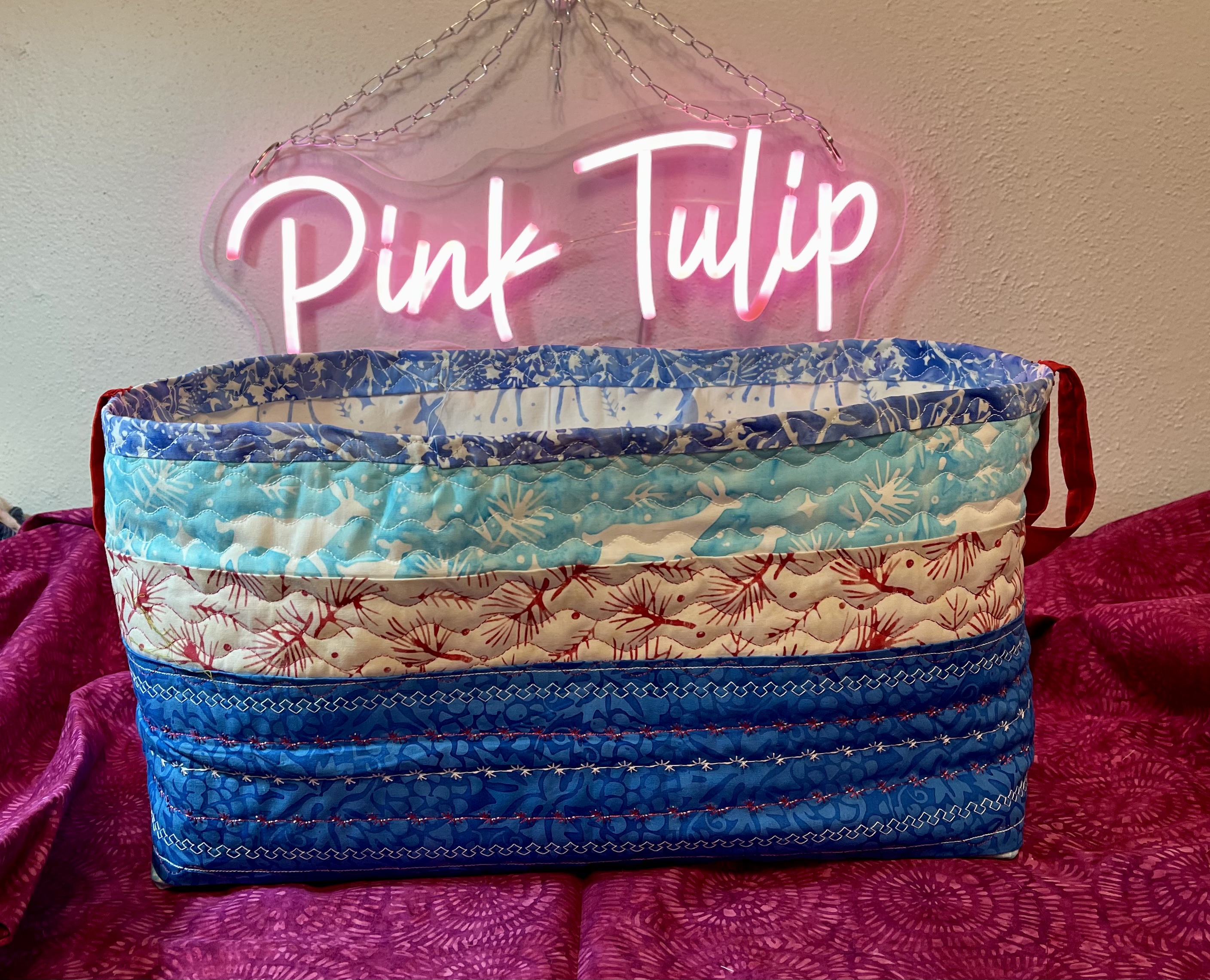 I had some Snowed In and Peppermint Sprinkles fabric collections left over from previous projects and wanted to make some holiday baskets. The Peppermint Sprinkles fabric 2.5-inch strips were matched with cut to length of fabric (LOF) Snowed In and other Island Batik fabrics that combine so well together. My Oliso Iron, Brother Dreamweaver and Schmetz Vinyl Needles were instrumental in the success of the basket projects. My Brother’s stitch assortment makes it fun to experiment with quilt stitching combinations. The vinyl needles made it easy to glide through those heavy layers and never skip ironing after sewing seams or quilting.