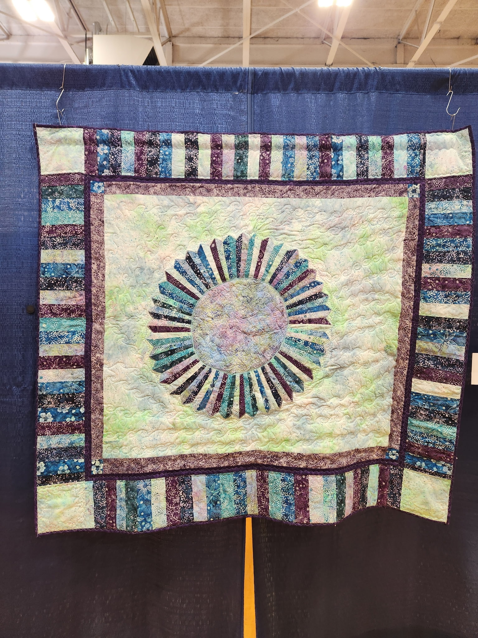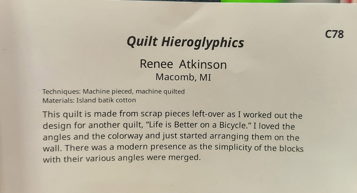 Quilt themes included Antique, Traditional, Contemporary, Spirit of 1775, and Quilts of Protest. Quilts in bloom were paired with floral arrangements and also on display were the organizing guild’s examples of Comfort Quilts which the guilds lovingly donate to veterans, nursing homes, disaster recovery sites and camps for medically challenged kids. My quilts, Dimensional Dresden accepted in the Traditional category and Quilt Hieroglyphics accepted in the Contemporary category were both made with Island Batik fabrics exclusively.
