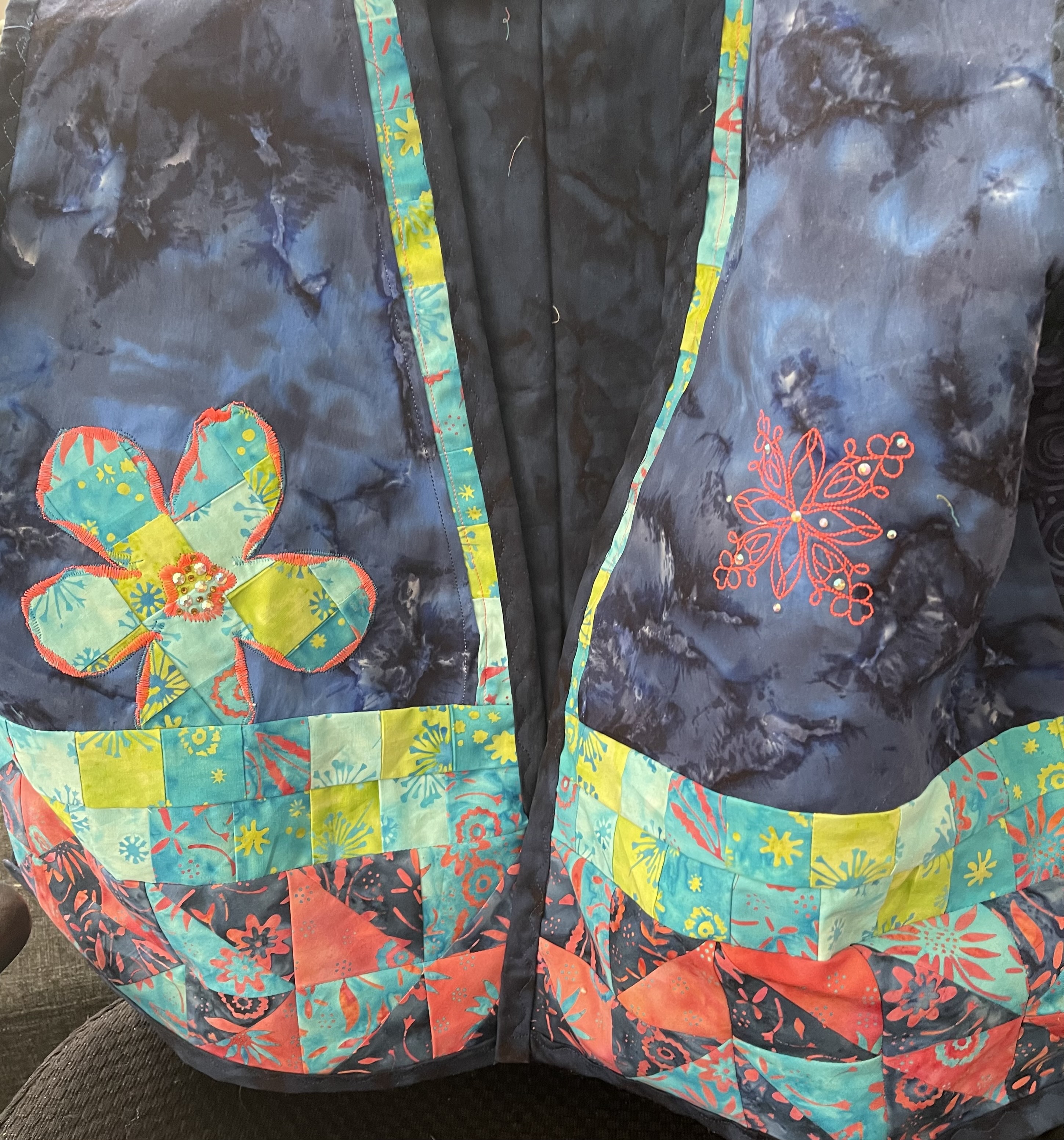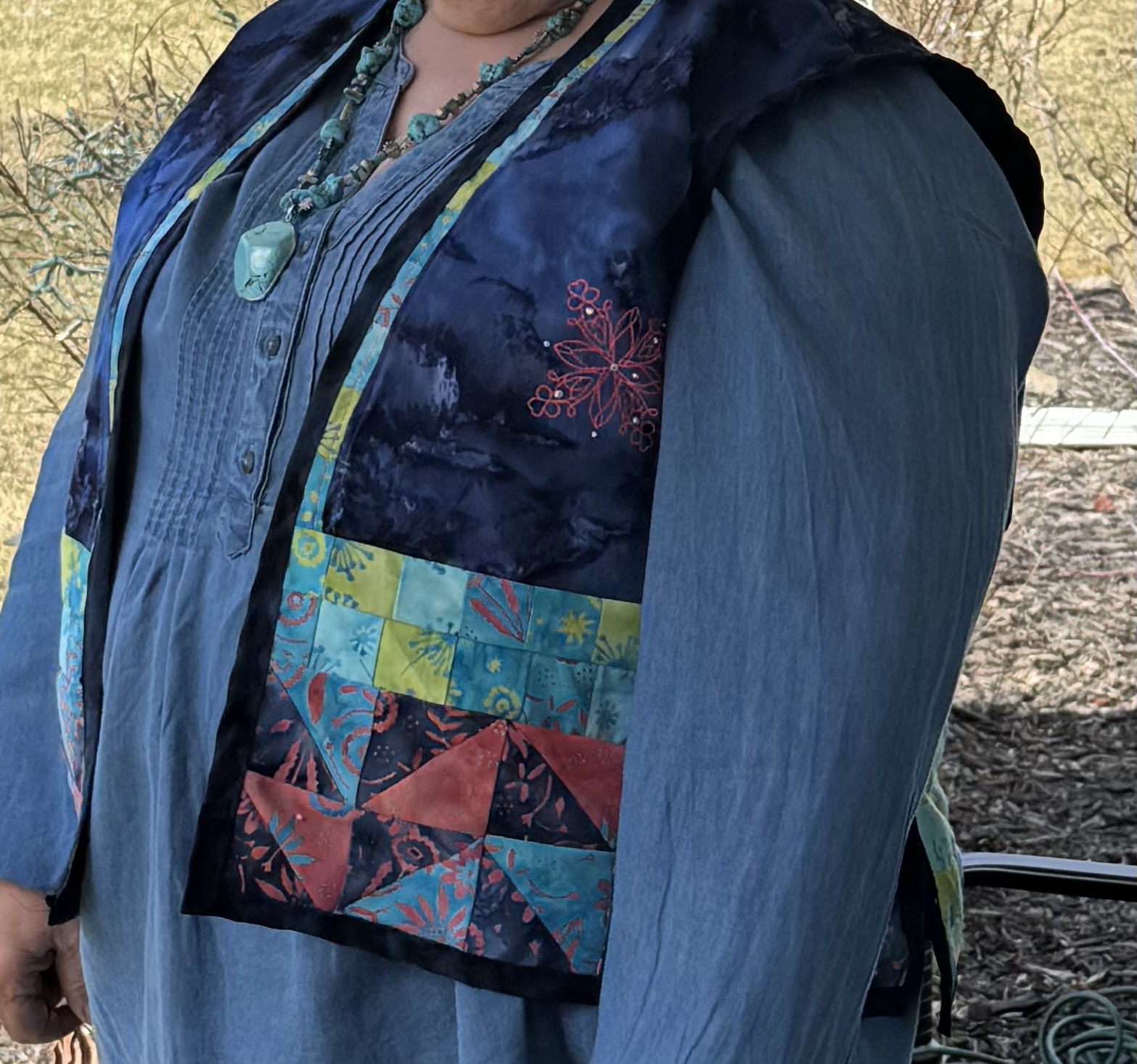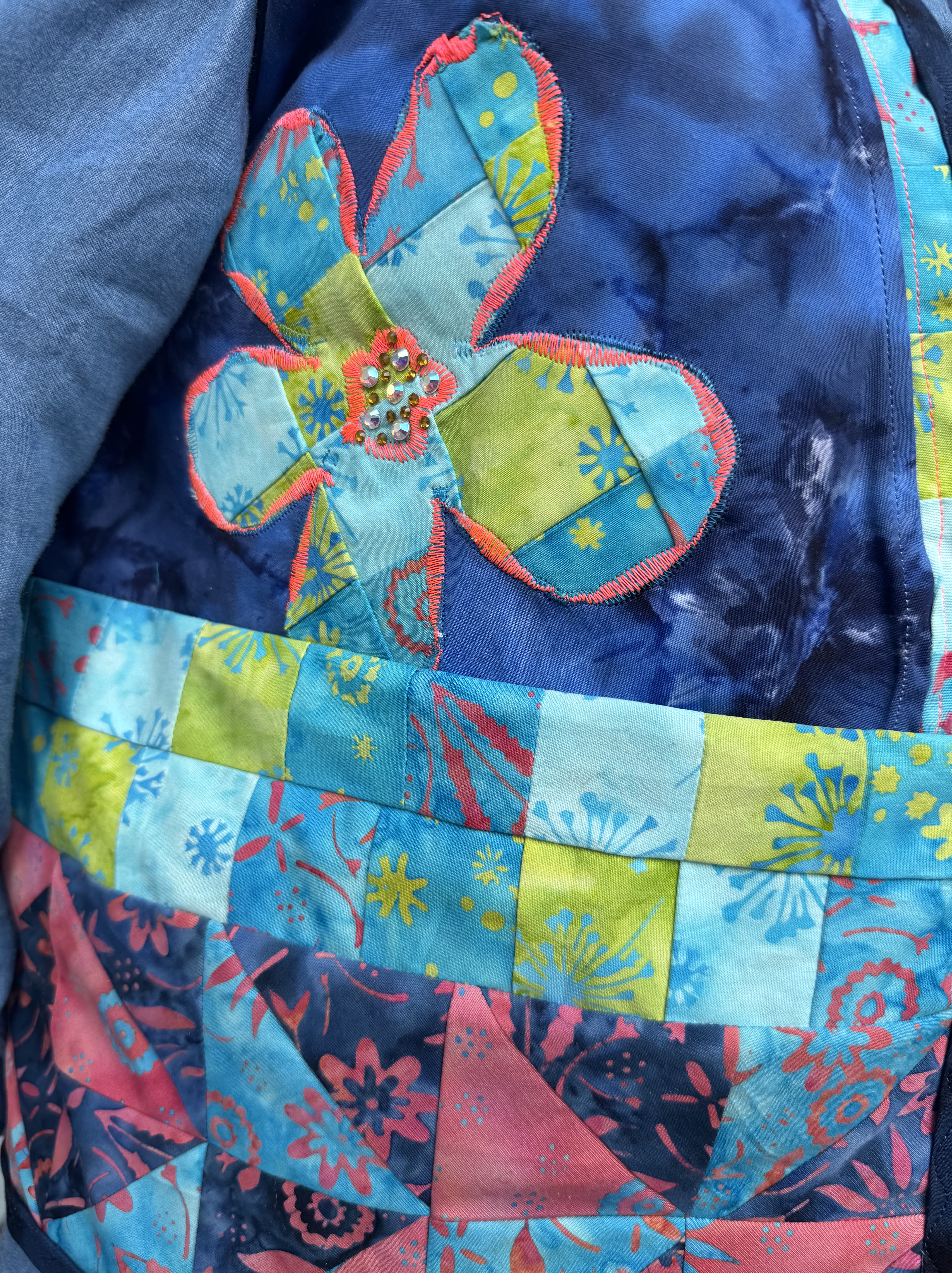 A vest pattern from my library of patterns was selected, and I made a few adjustments to obtain the look I wanted. The Island Batik Just Dandy collection by Kate Colleran includes wonderful summer colors which were cut in a mix of 2.5-inch squares and 3-inch squares made of HSTs. I have a Brother Dreamweaver for piecing and quilting; at the start of each new project, I clean the bobbin housing and change my Schmetz needle. I used Purple Eggplant and Multi Turquoise both gorgeous fabrics from the Essence collection by Jerry Khiev.
