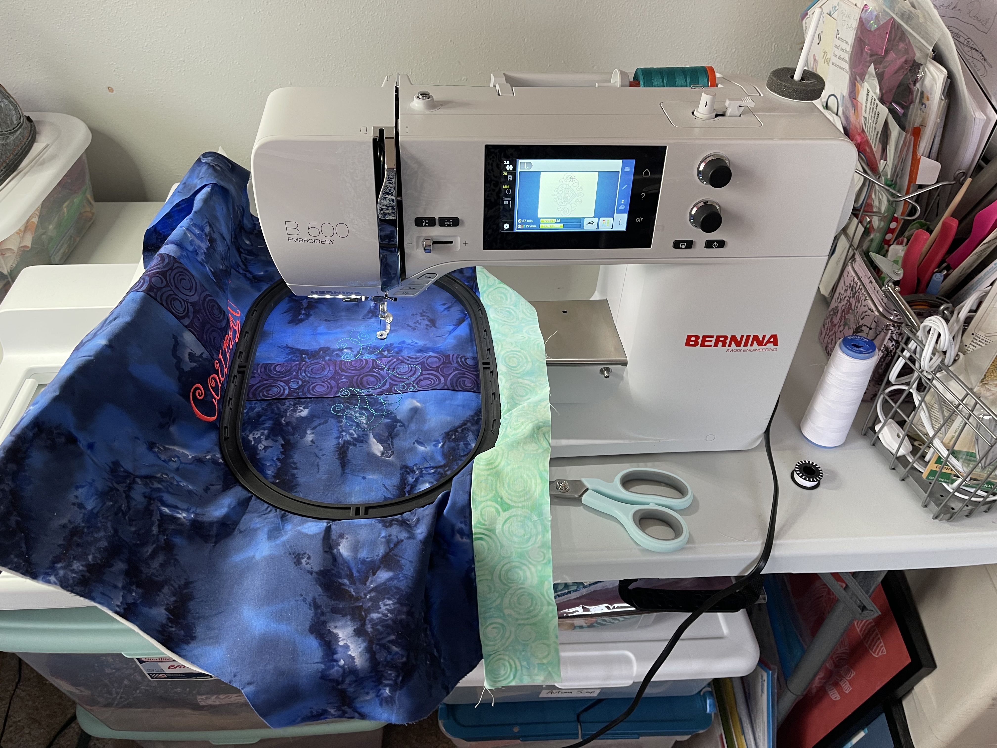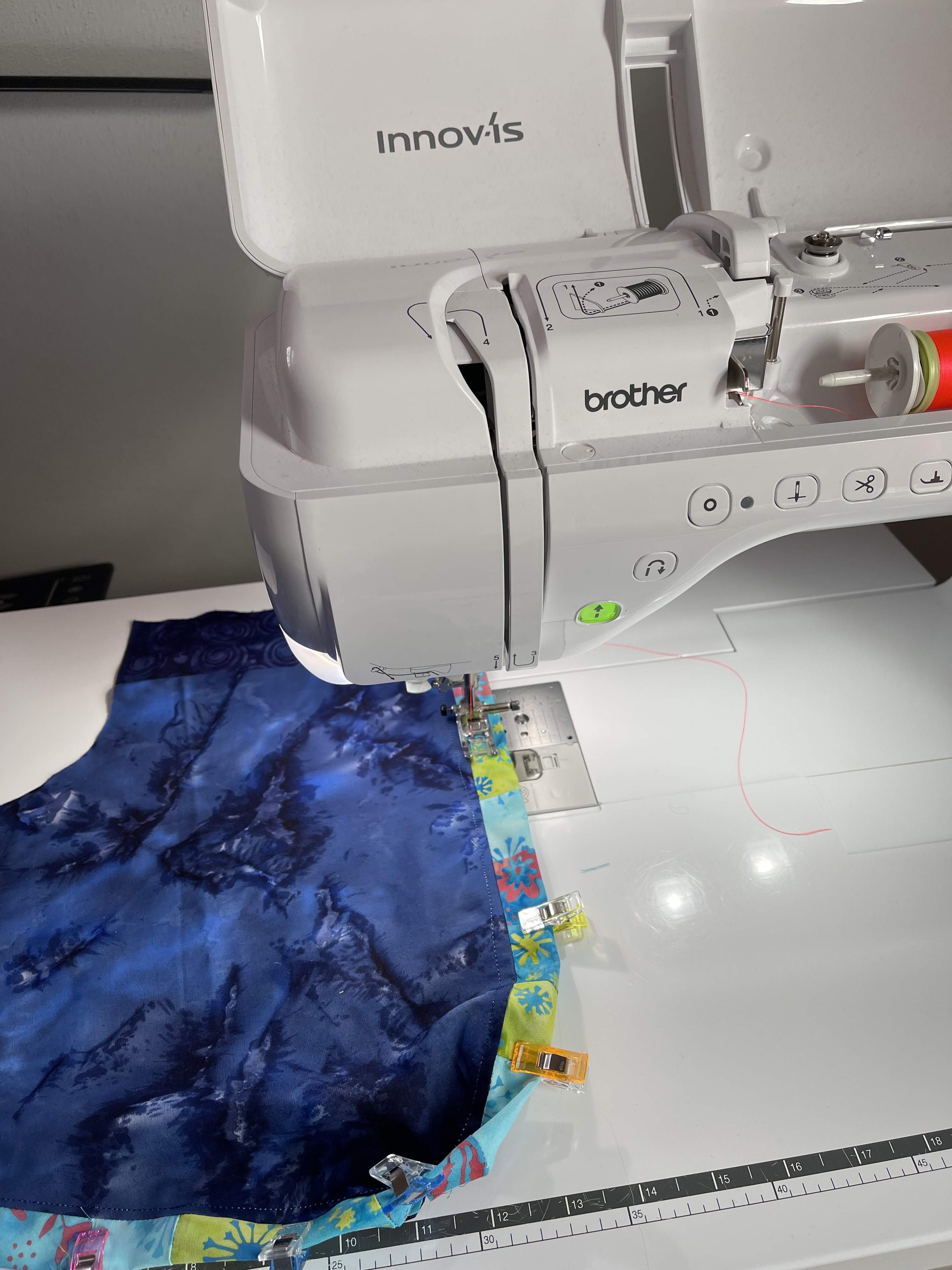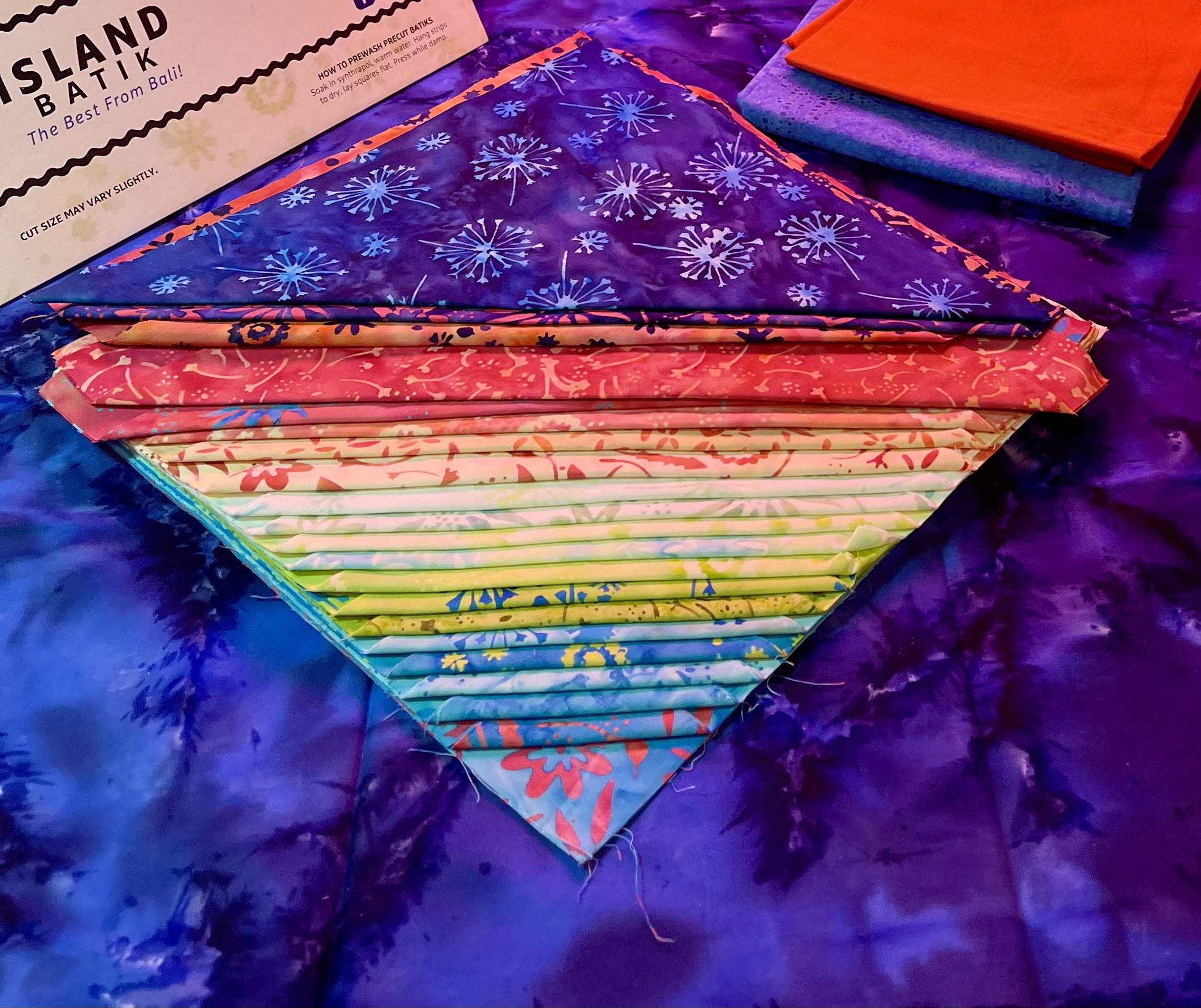 A vest pattern from my library of patterns was selected, and I made a few adjustments to obtain the look I wanted. The Island Batik Just Dandy collection by Kate Colleran includes wonderful summer colors which were cut in a mix of 2.5-inch squares and 3-inch squares made of HSTs. I have a Brother Dreamweaver for piecing and quilting; at the start of each new project, I clean the bobbin housing and change my Schmetz needle. I used Purple Eggplant and Multi Turquoise both gorgeous fabrics from the Essence collection by Jerry Khiev.