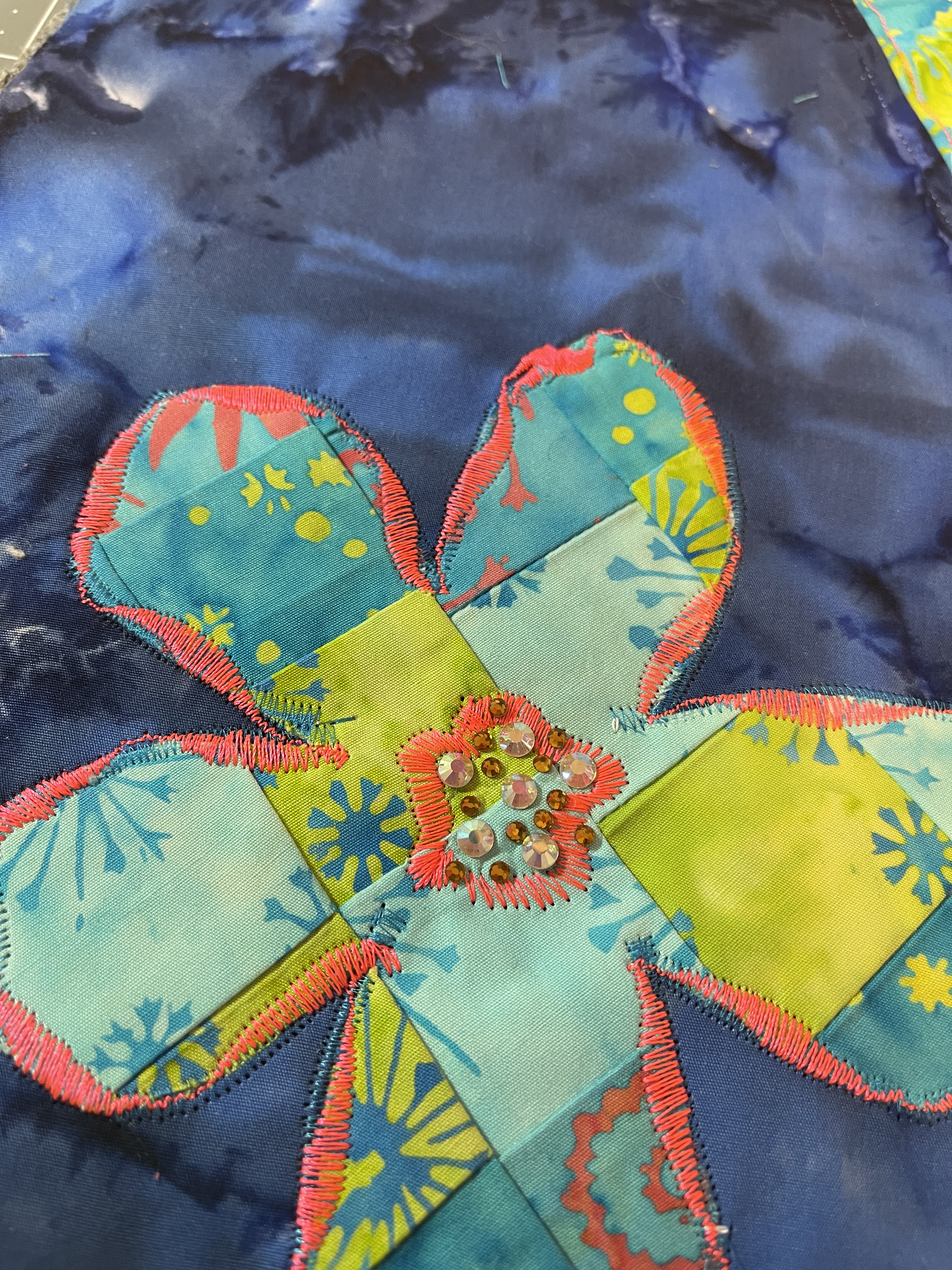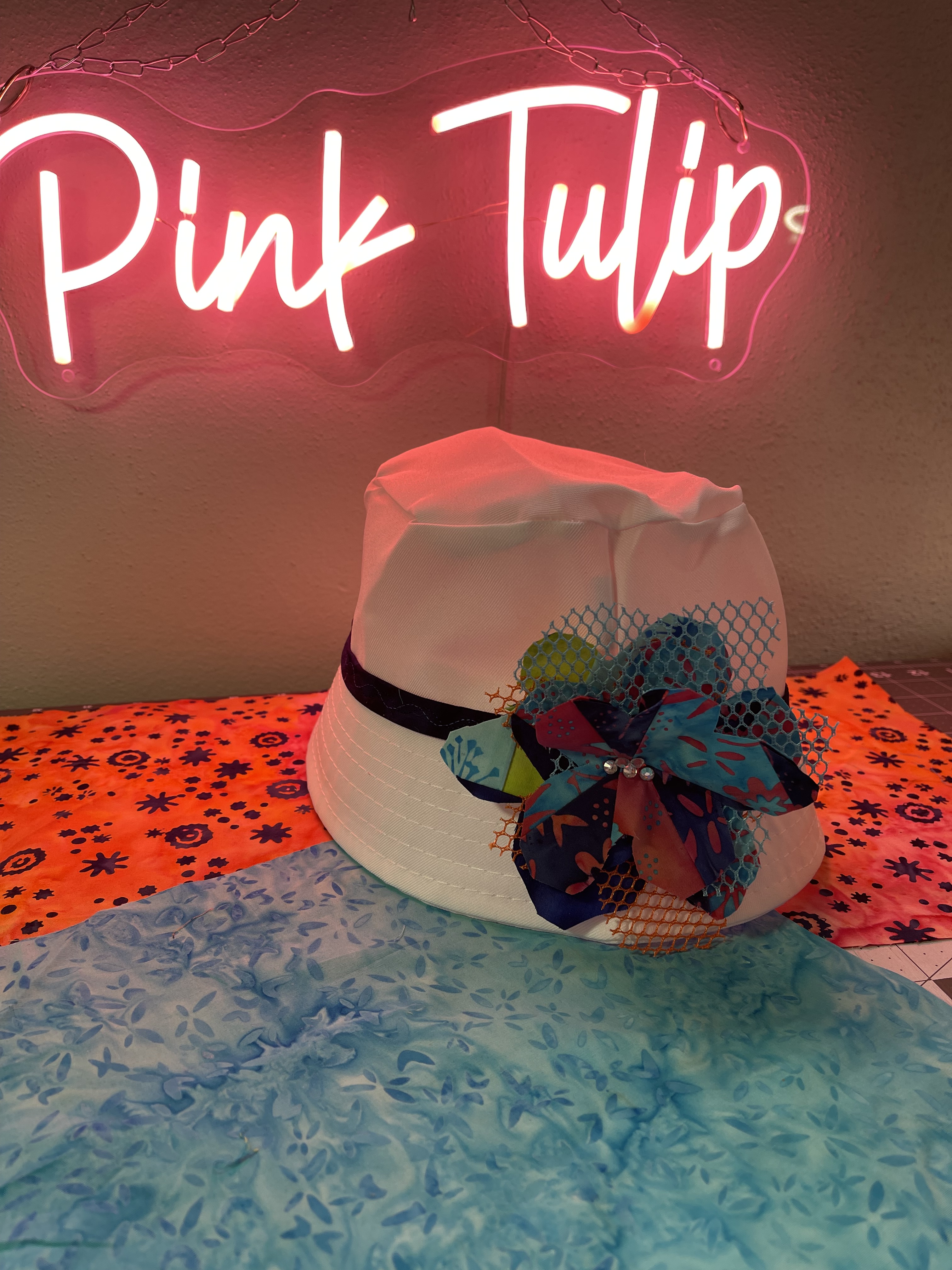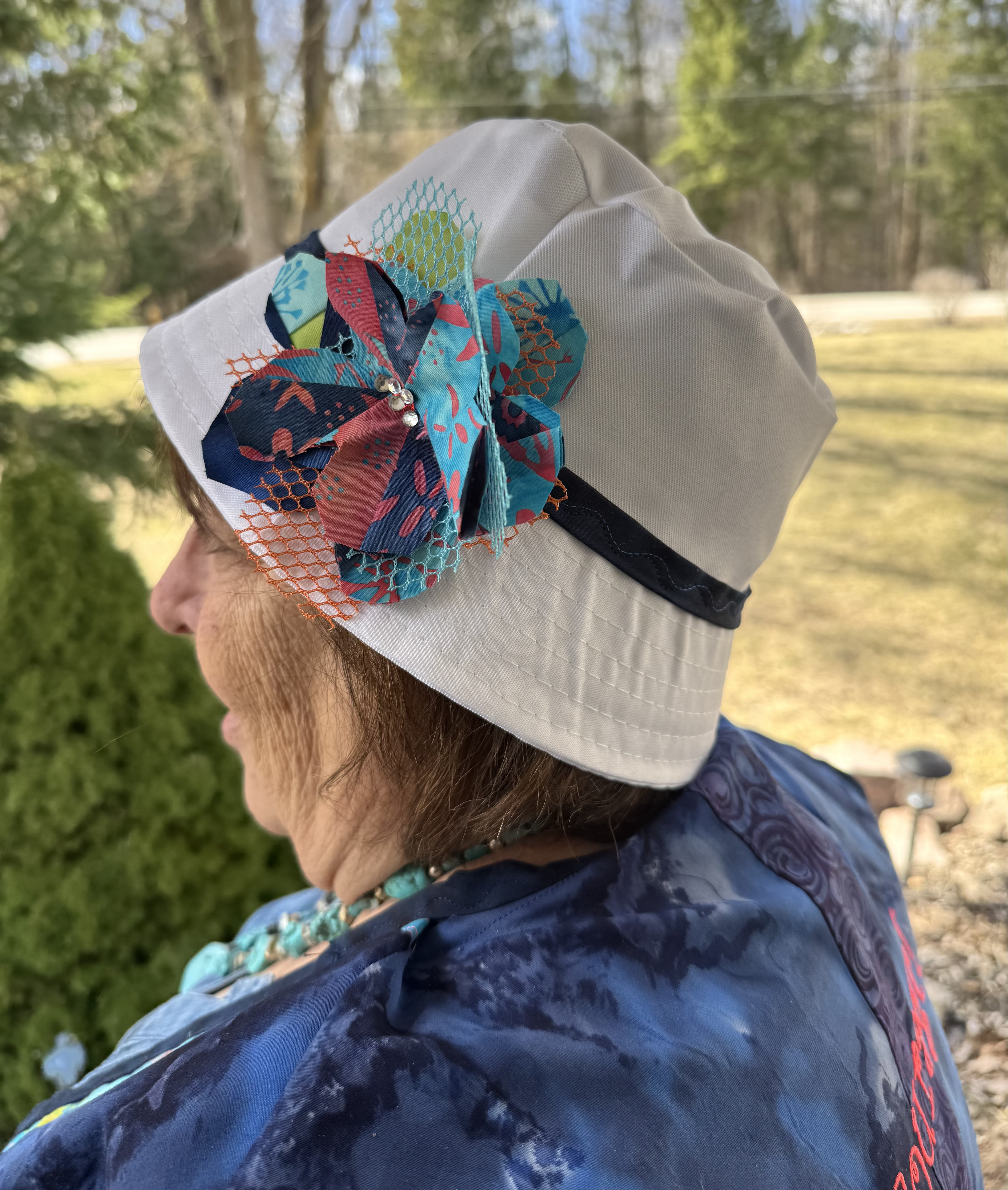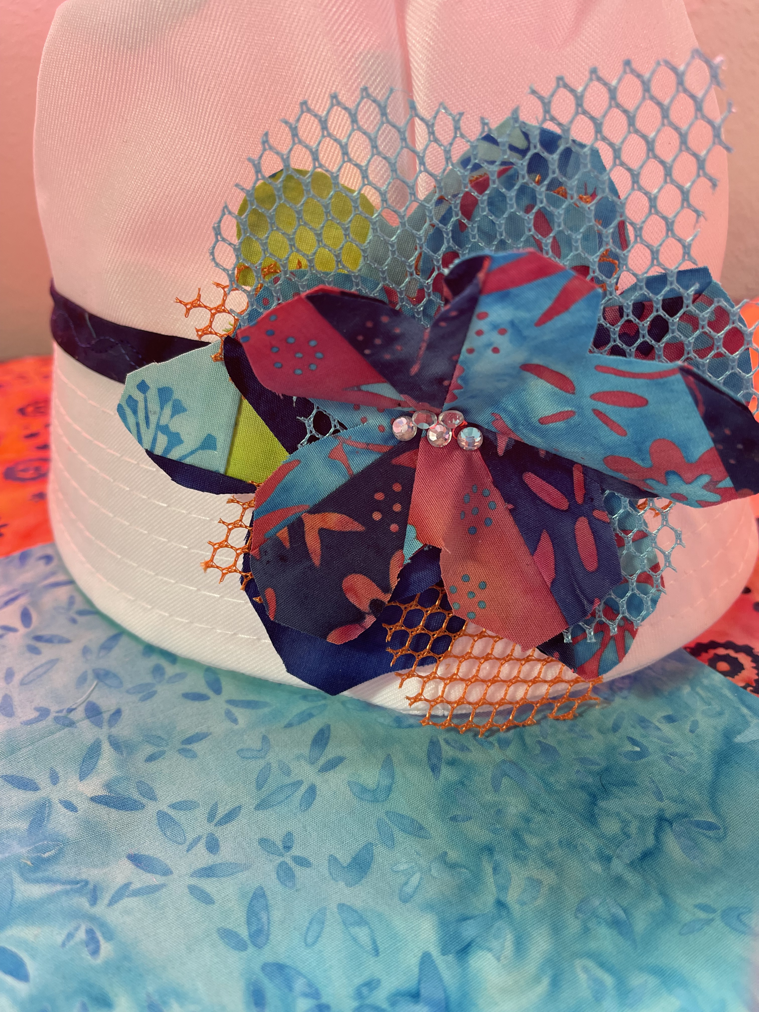 I had ordered a dozen white bucket hats to embellish as summer items for my shop inventory at Uptown Girl Novelties in New Baltimore, Michigan. A band of dark blue from the Island Batik Foundations’ Brilliant Blue collection was sewed along the brim of one of the white bucket hats. Left over HSTs were sewed together then three flowers were cut out. By Annie blue and orange mesh flowers were also added. The flowers were stacked and hand sewn in the center and once again rhinestones added.