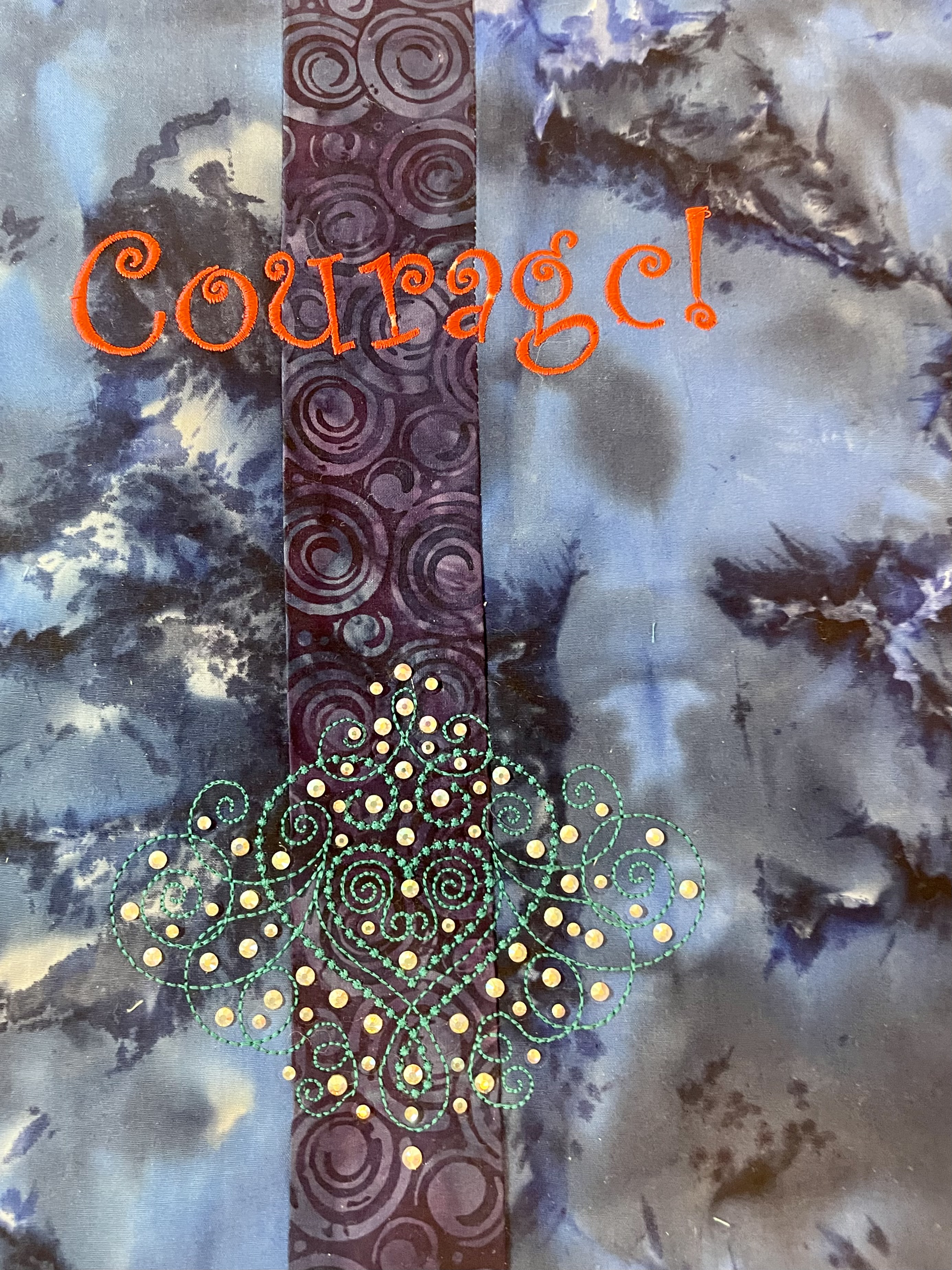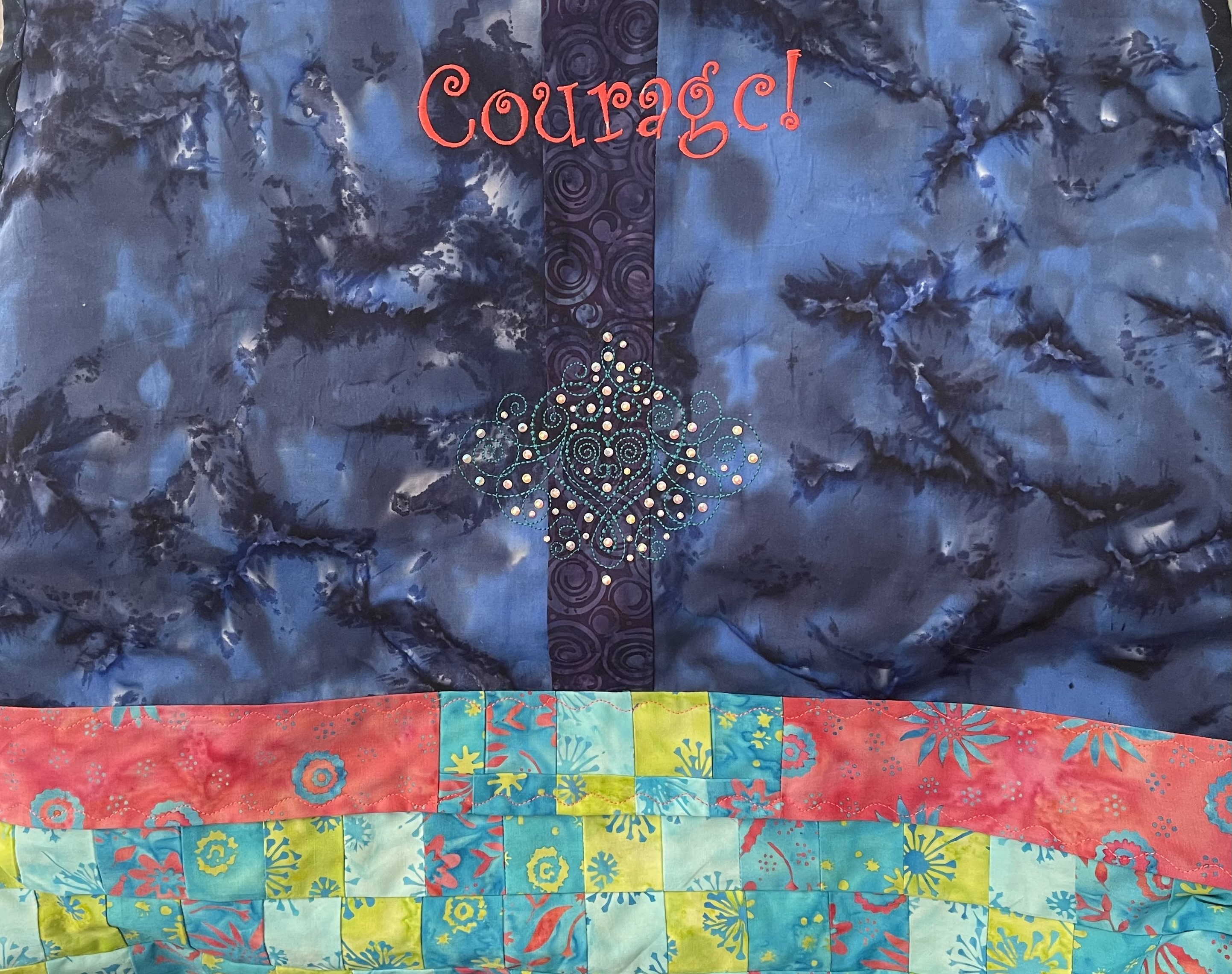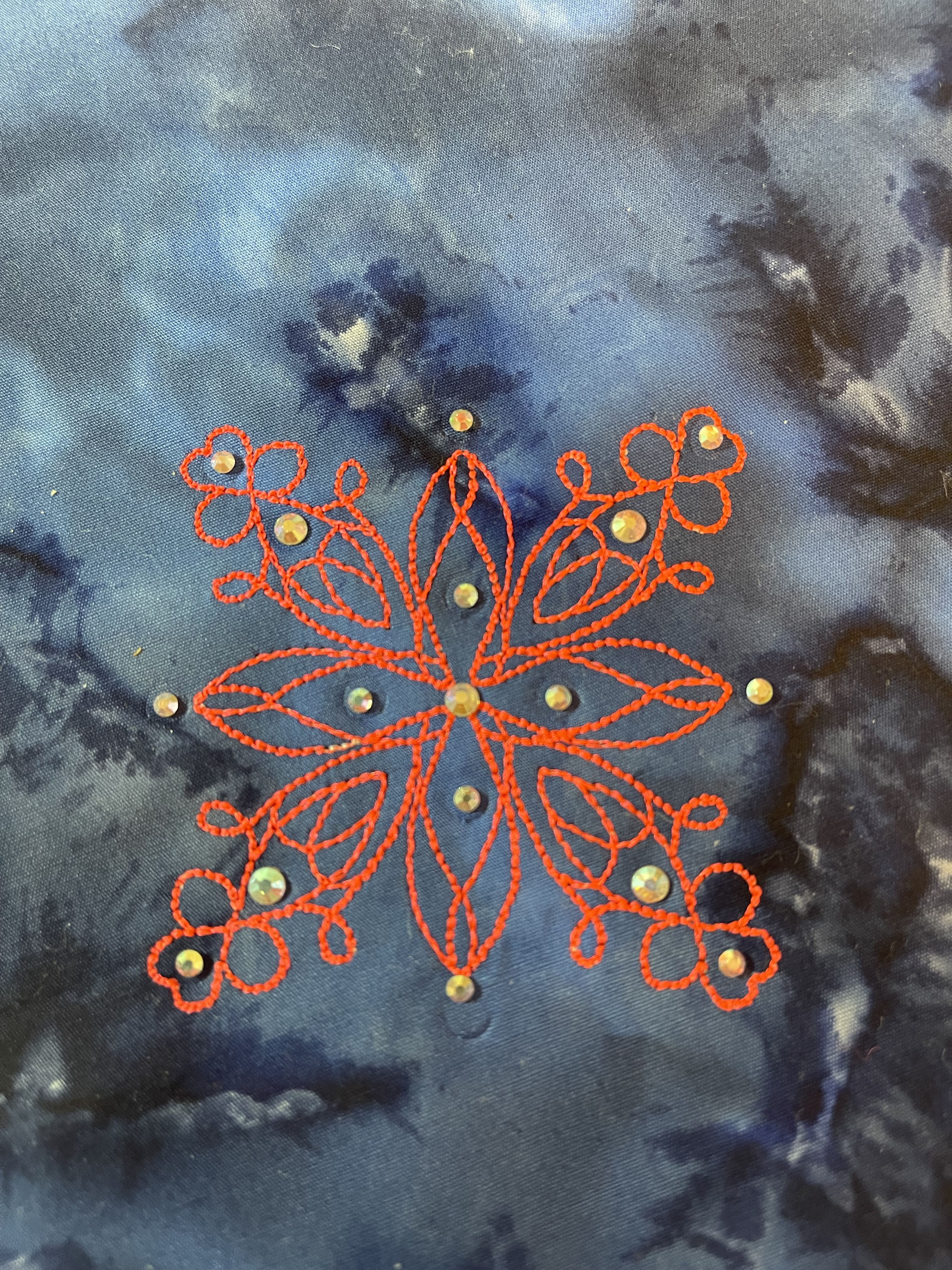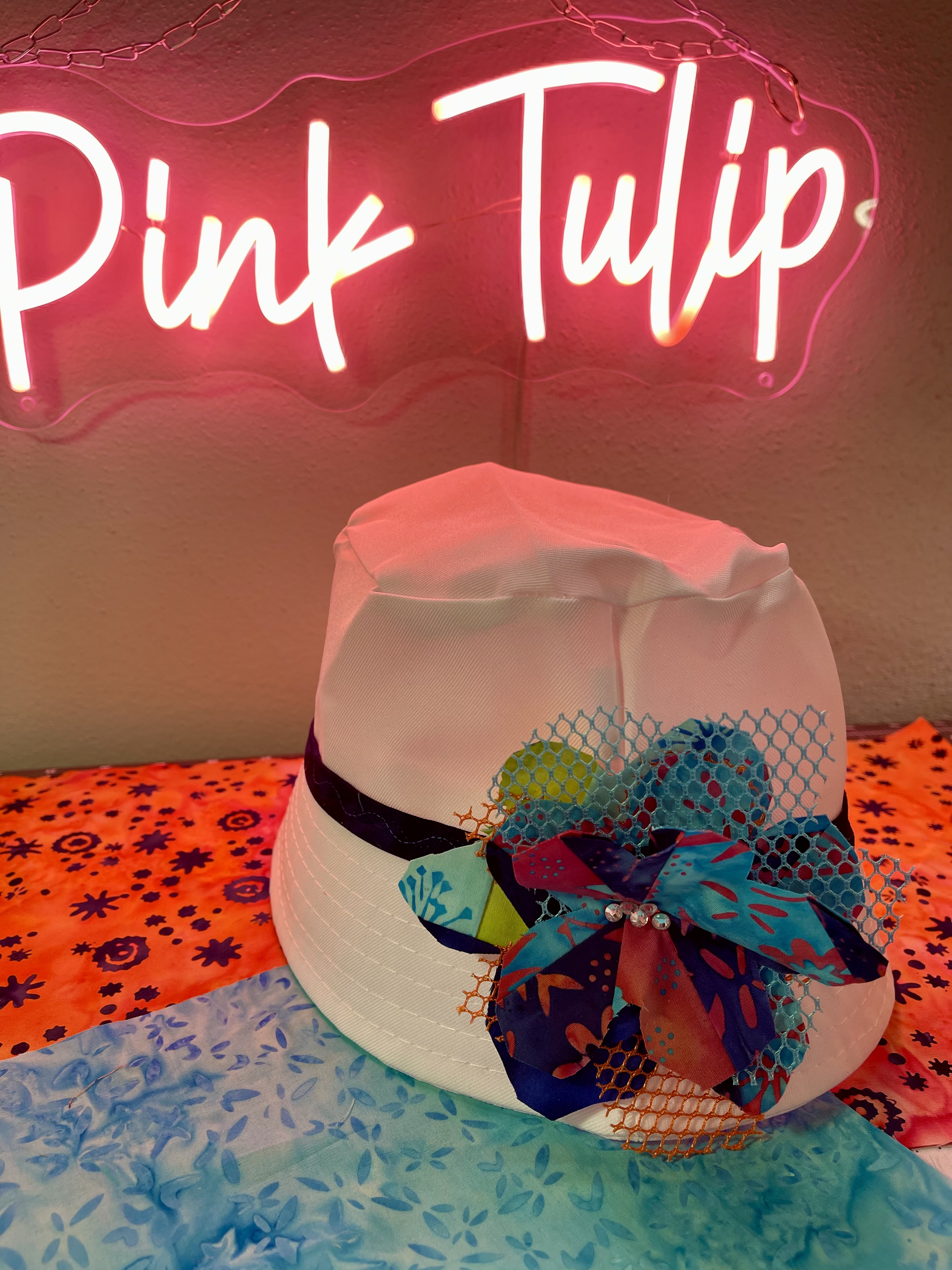 I had ordered a dozen white bucket hats to embellish as summer items for my shop inventory at Uptown Girl Novelties in New Baltimore, Michigan. A band of dark blue from the Island Batik Foundations’ Brilliant Blue collection was sewed along the brim of one of the white bucket hats. Left over HSTs were sewed together then three flowers were cut out. By Annie blue and orange mesh flowers were also added. The flowers were stacked and hand sewn in the center and once again rhinestones added.