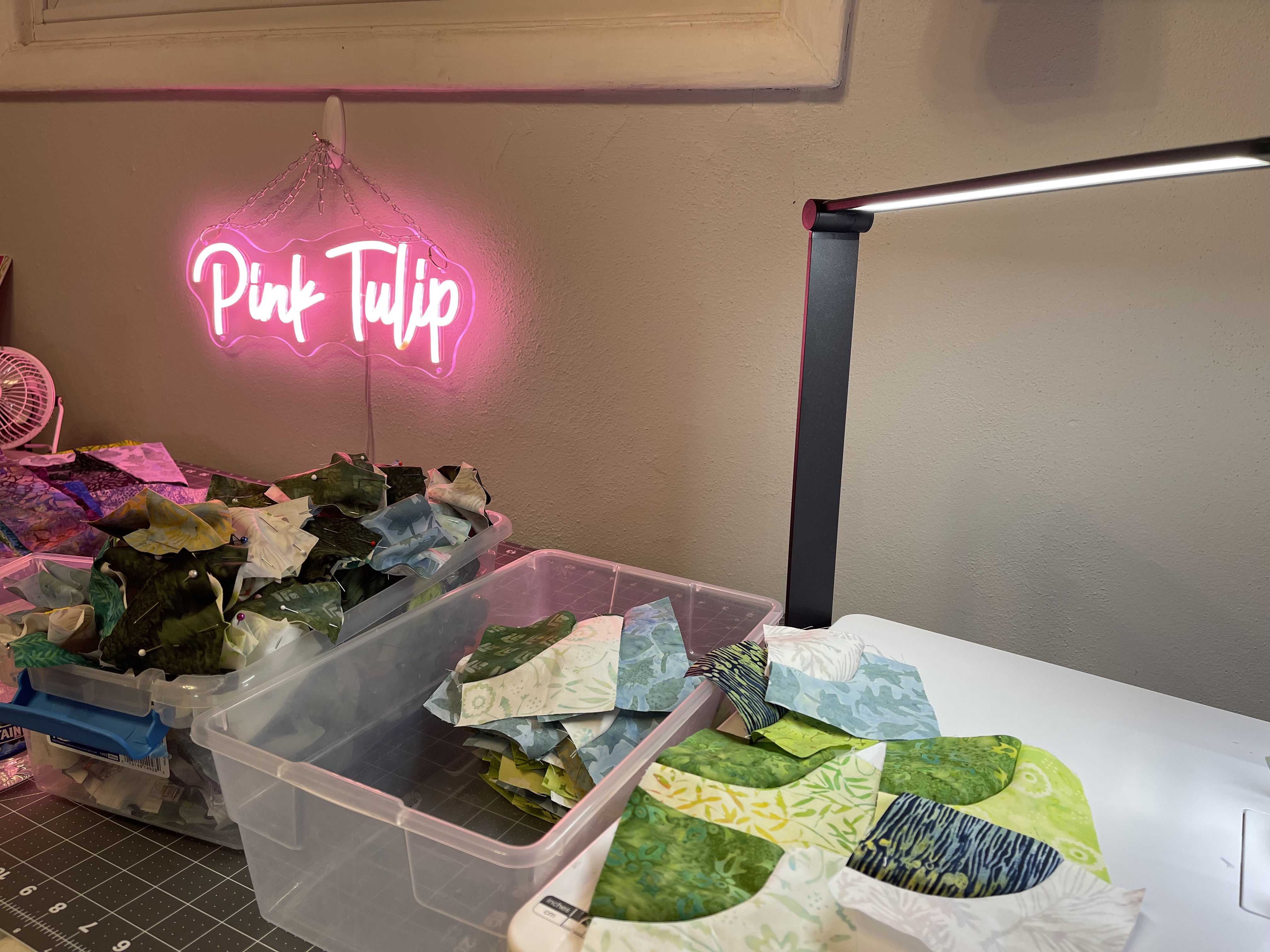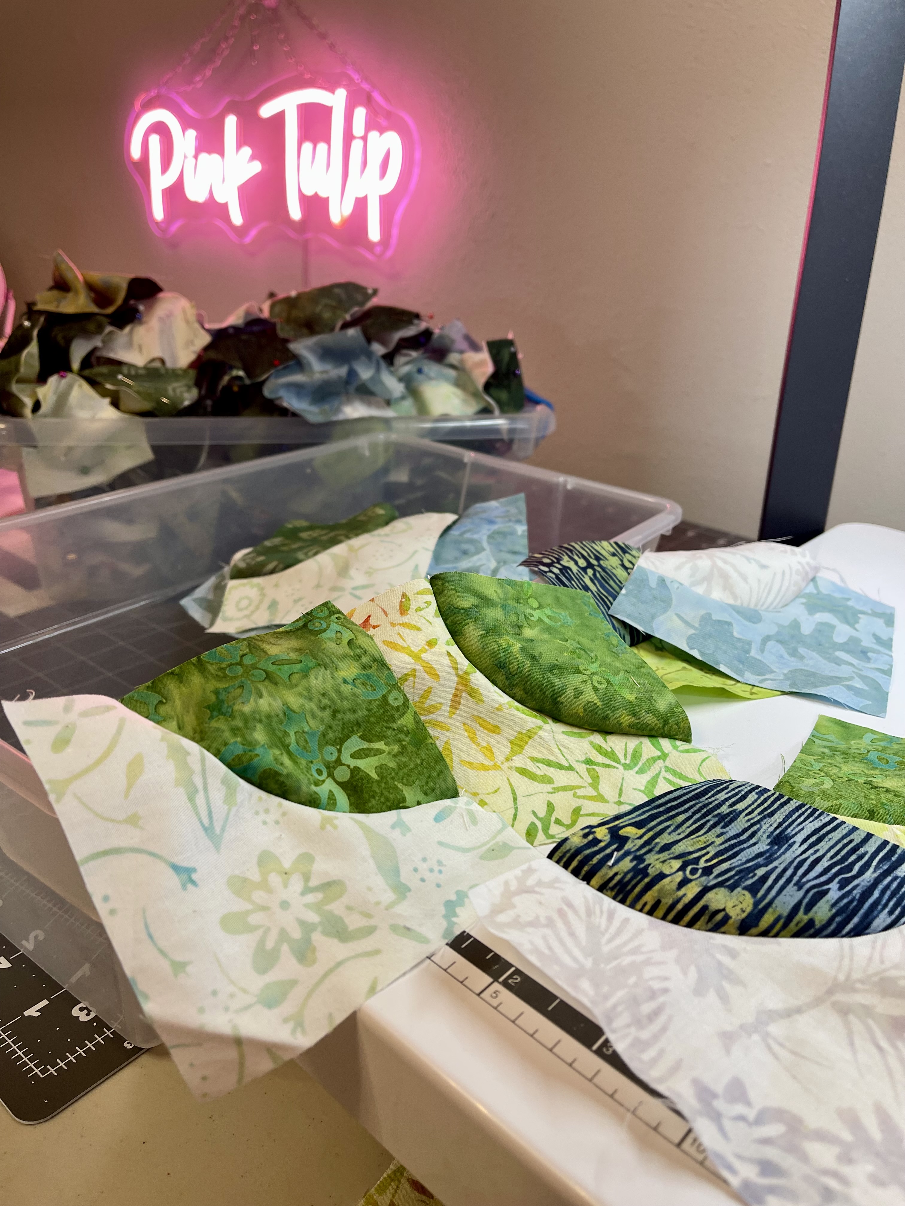 There were equal amounts of light and dark “A” pieces and “B” pieces. Assembly for sewing matched a light was paired with a dark. Then clamped at corners and pinning centers was the first attempt at pre-sew prep. The prepped pieces were put in another empty shoe box. The two shoe boxes were essential to manage completion steps. Additionally, relocation occurred easily within my small studio.