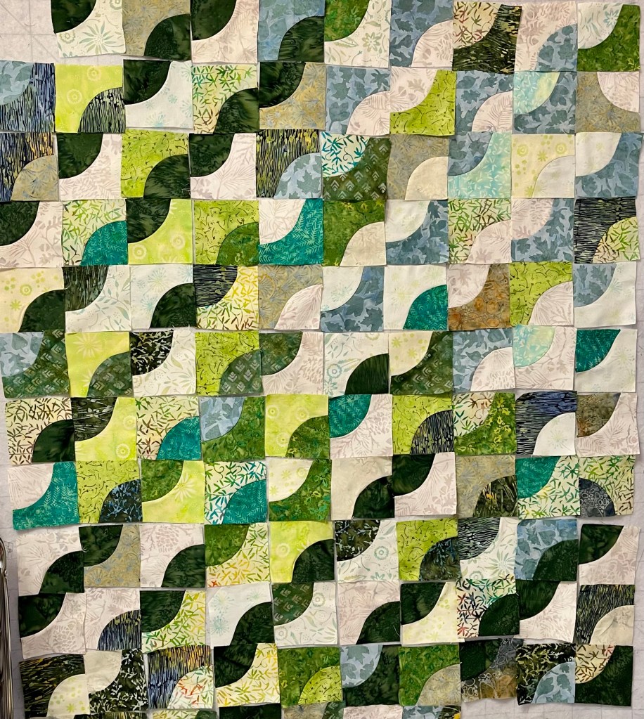 I admit, my design was unconventional and took time to realize on the design wall. The goal for my Drunkards Path was to assemble the 4-inch blocks to represent Shadowed Paths. The piecing matched light to dark in varying degrees. The varying degrees of greens to gray greens in the Floral Fun collection were perfect for my goal.
