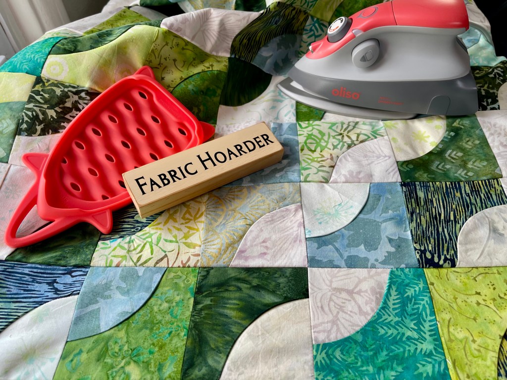 My Oliso project iron was very important especially when pressing the initial blocks! The picture above was taken at center panel completion to show a mistake found; can you see it? I thought I was diligently organized as I pulled blocks from the design wall. In the end, seam ripper in hand, I went to town on three rows of stitching–phew!!