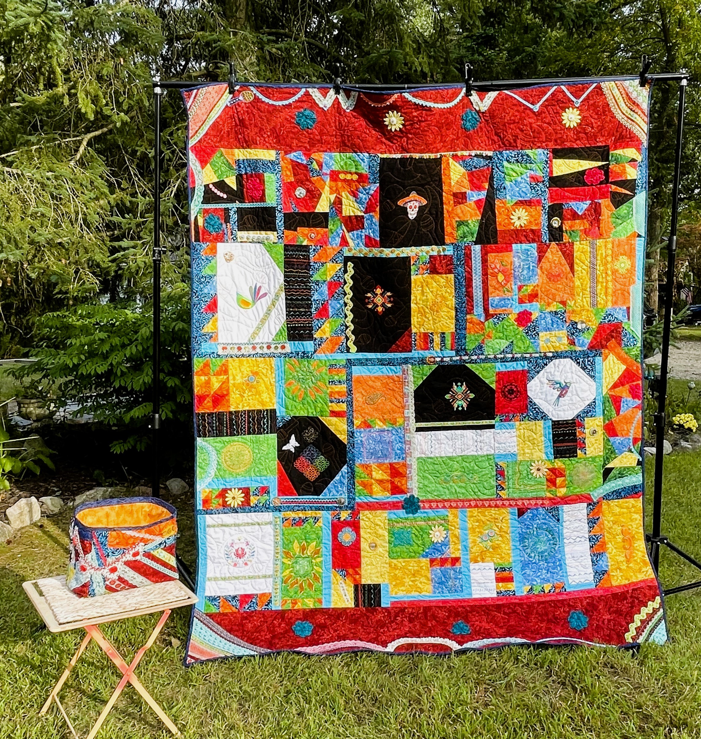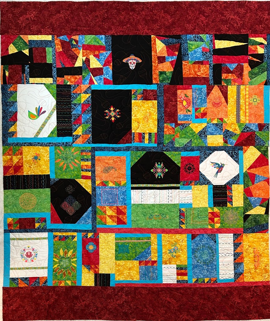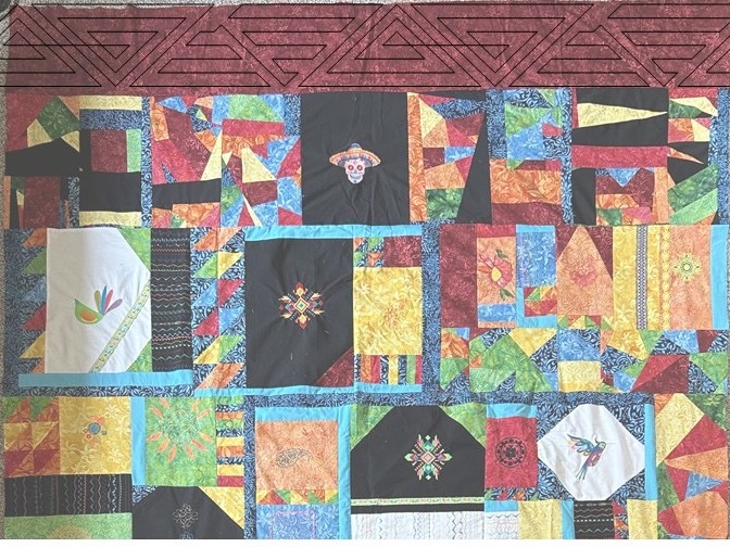 Birds are important in Mexican culture. Hummingbirds hold a special place in Mexican culture and folklore. Their speed and agility symbolize agility, energy, joy, and playfulness. In Aztec mythology, they were seen as spiritual warriors, and their fast flying represented diligence and endurance. The Aztecs believed that fallen warriors would return to earth as hummingbirds. There are two machine embroidered bird panels in the quilt both were fun to do; one is a hummingbird, and one is a stylized tinamou, the most ancient of birds.