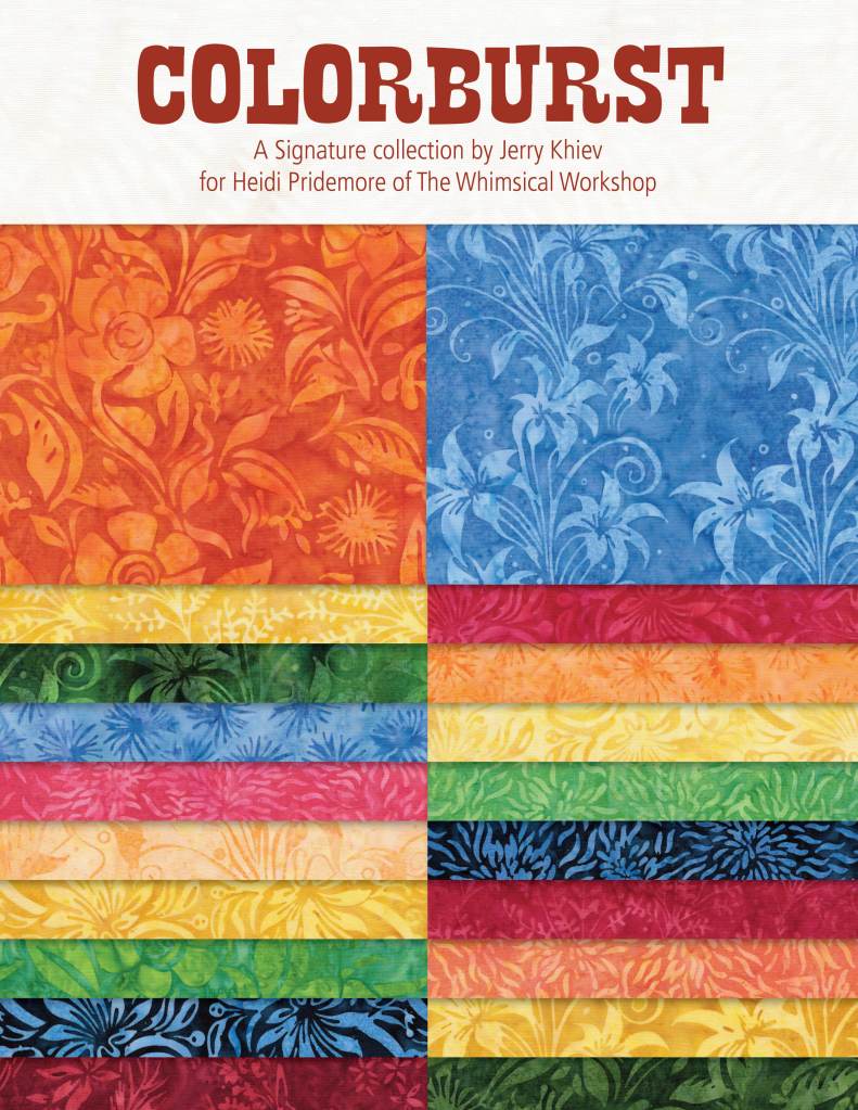 My assigned collection for this challenge was Colorburst by Jerry Khiev for Heidi Pridemore of the Whimsical Workshop. This bright collection was my inspiration to do a Colcha Loca or Hispanic Crazy Quilt.