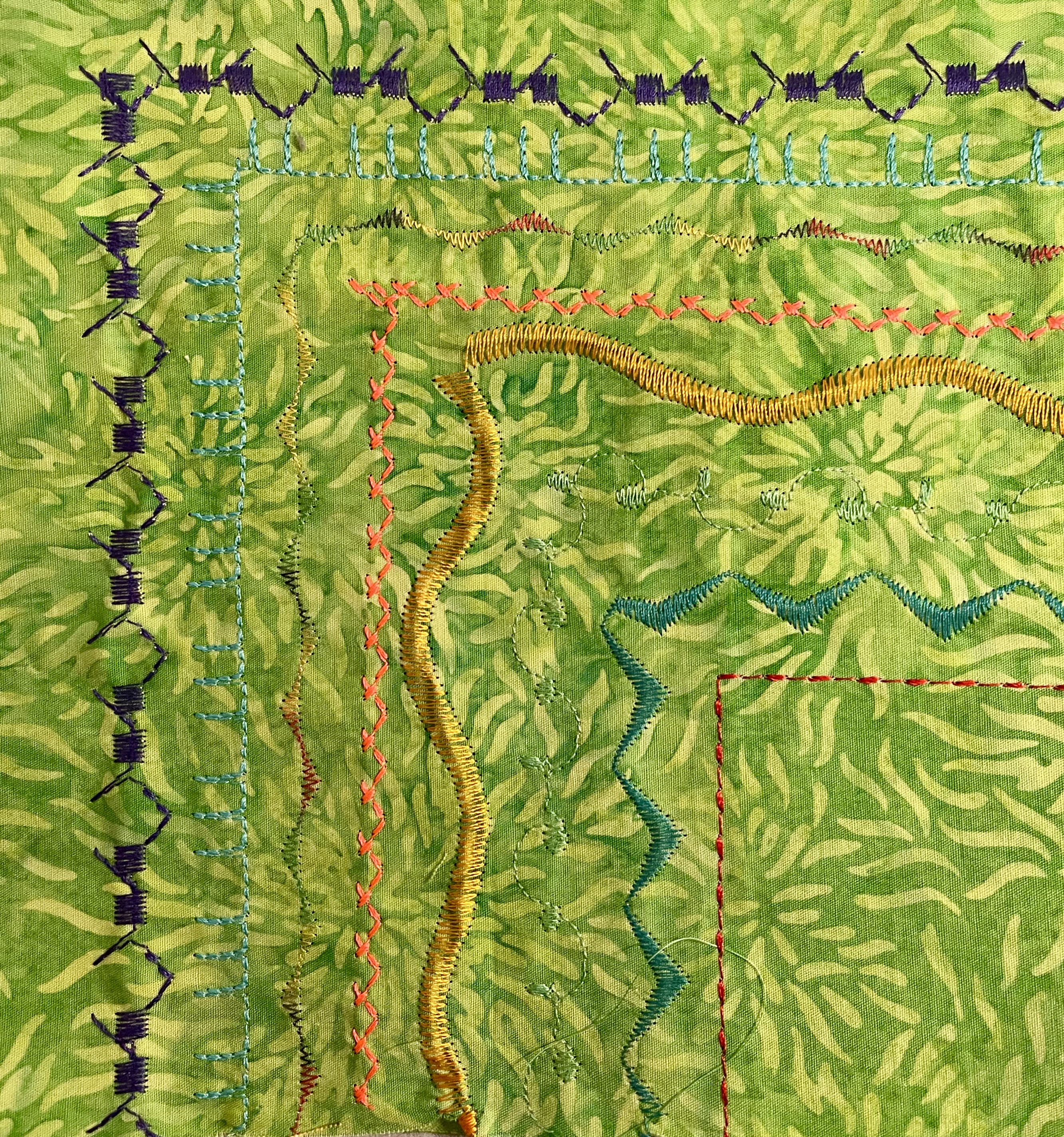 Quilt embellishments were accomplished after quilting but prepped while I waited for the longarmer. Pinterest is my go-to for embroidery stitches and I found a wonderful resource for a dictionary of stitches. Sharon Boggon of Pintangle is an authority on crazy quilting. Pintangle’s focus is on hand embroidery, slow stitch and crazy quilting. You will find tutorials, free patterns, stitch instructions, tips, a way to relax and stitchers eye candy! This page reminded me that we can create our own colorways by combining threads–two or three threads twisted to create a unique embroidery option.