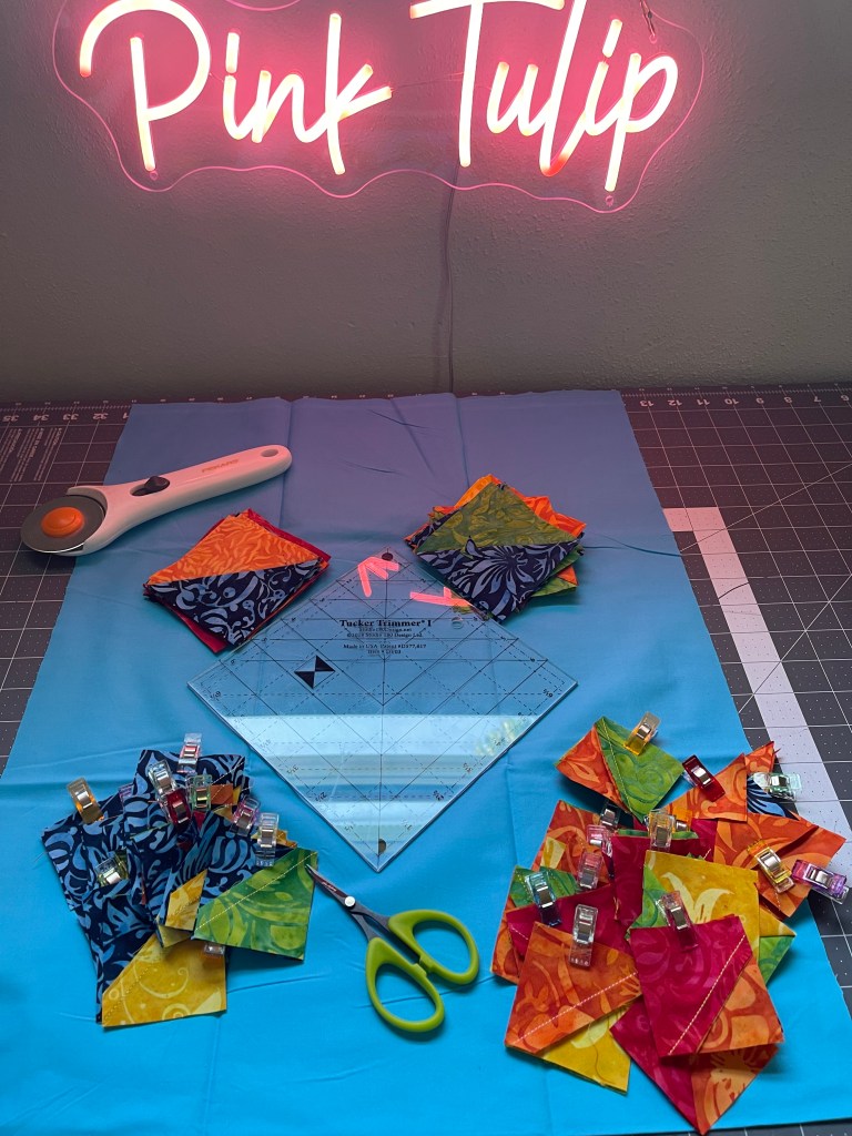 HSTs were created from combos of Colorburst in two sizes. The Tucker Trimmer from Studio 180 Designs always helps keep those HST blocks crisp! Piano key blocks were created from HST scraps. My Oliso Project Iron was essential when ironing these HSTs on the Oliso wool mat!