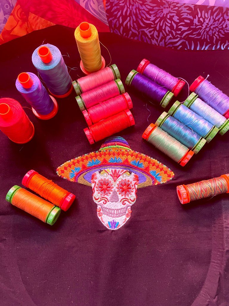 My Bernina B500 Embroidery Machine kicked out 26 embroidered panels. Many were already available in the machine’s library while others were downloaded from Etsy sellers. My favorite? The Sombrero Skull motif! The Bernina Midi Embroidery hoop was my machine embroidery sidekick because it has an ergonomic twist-lock-mechanism, the hoop can be opened with a pinch and closed with a twist.