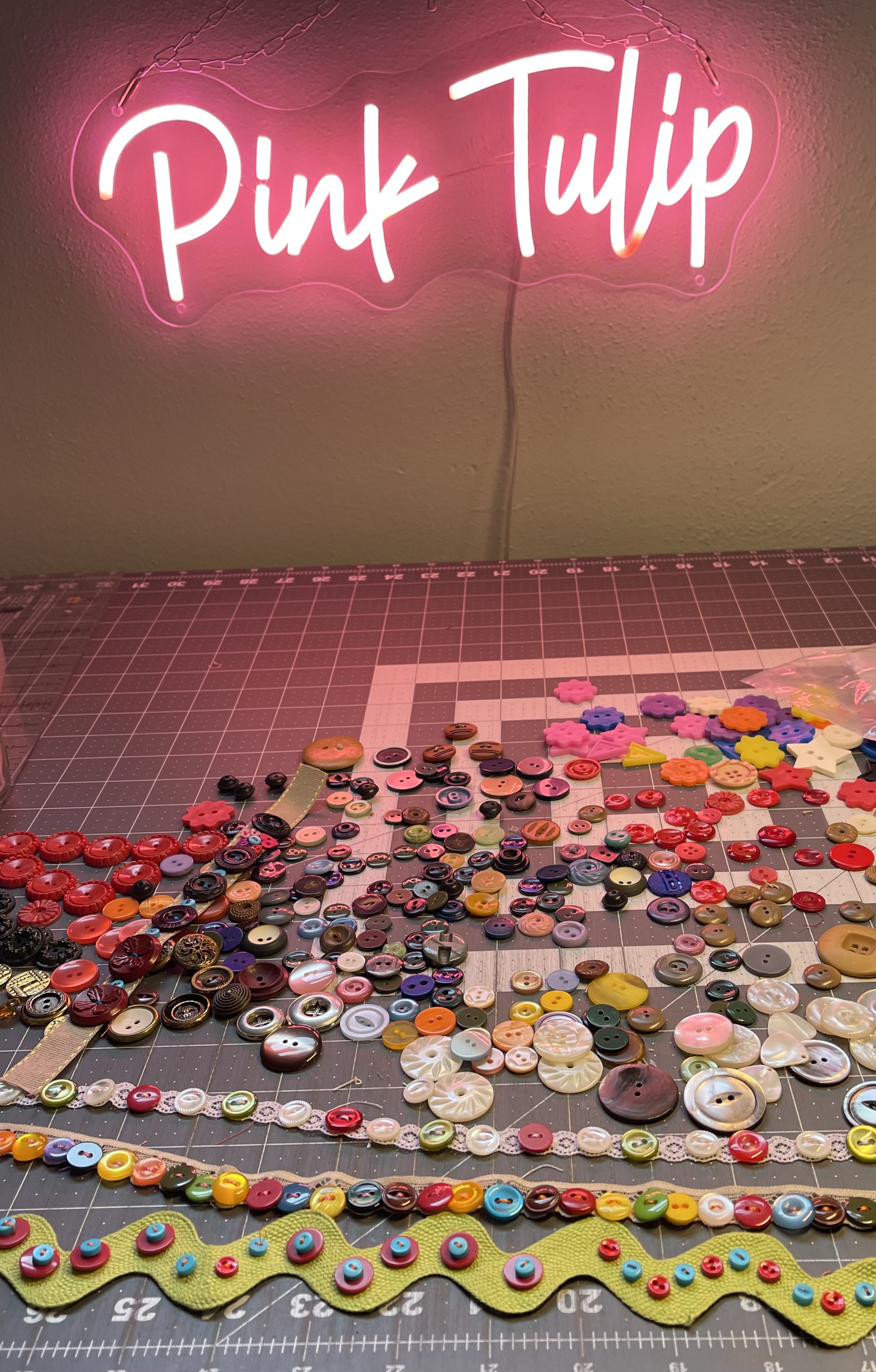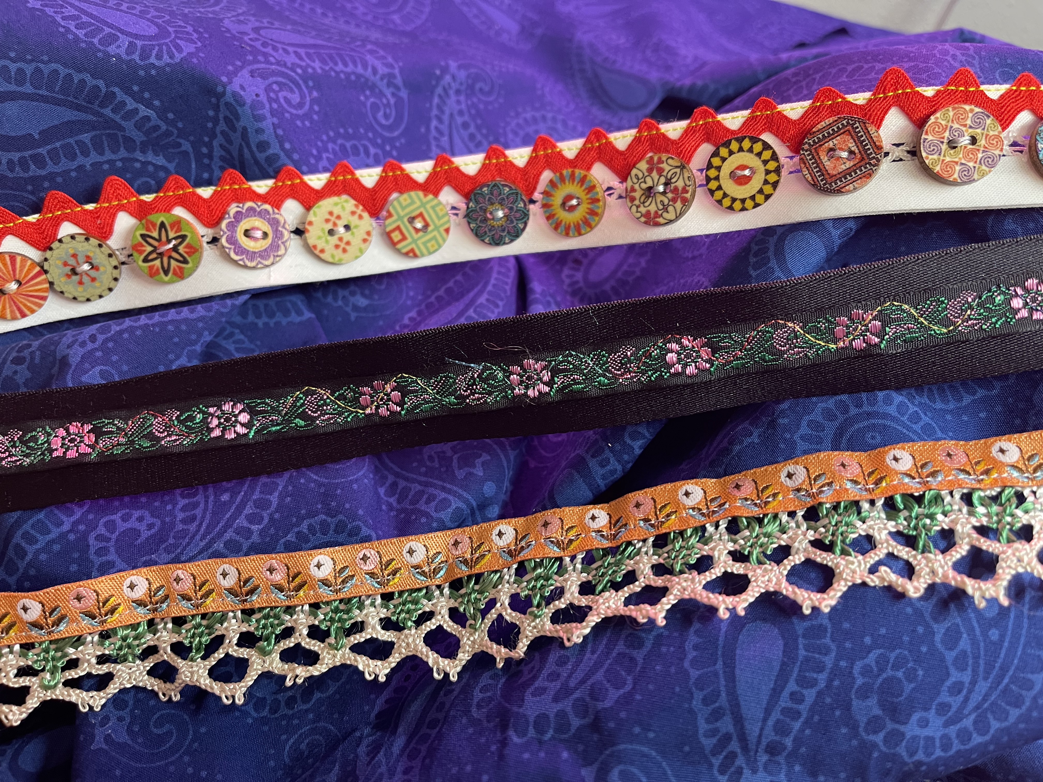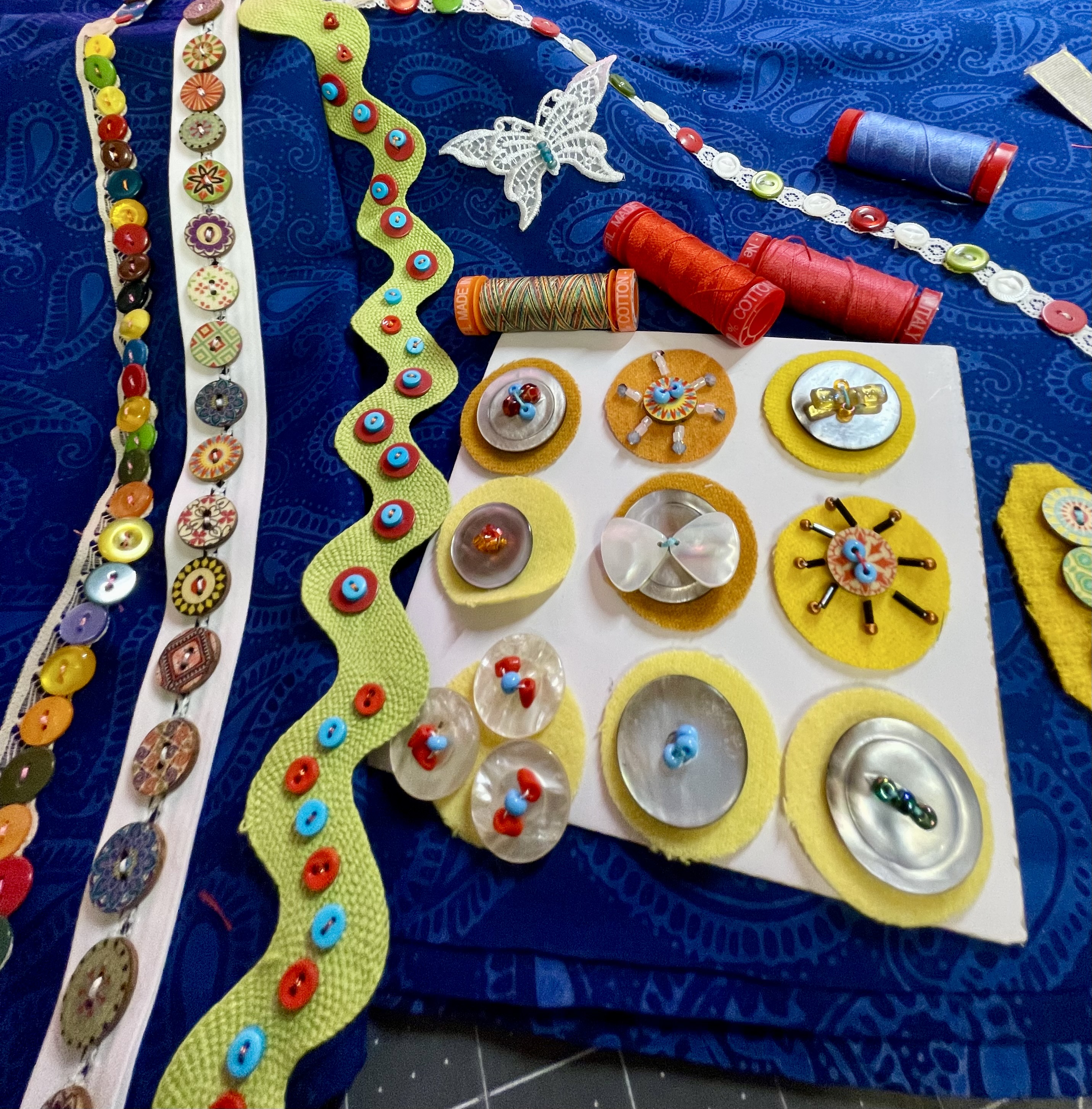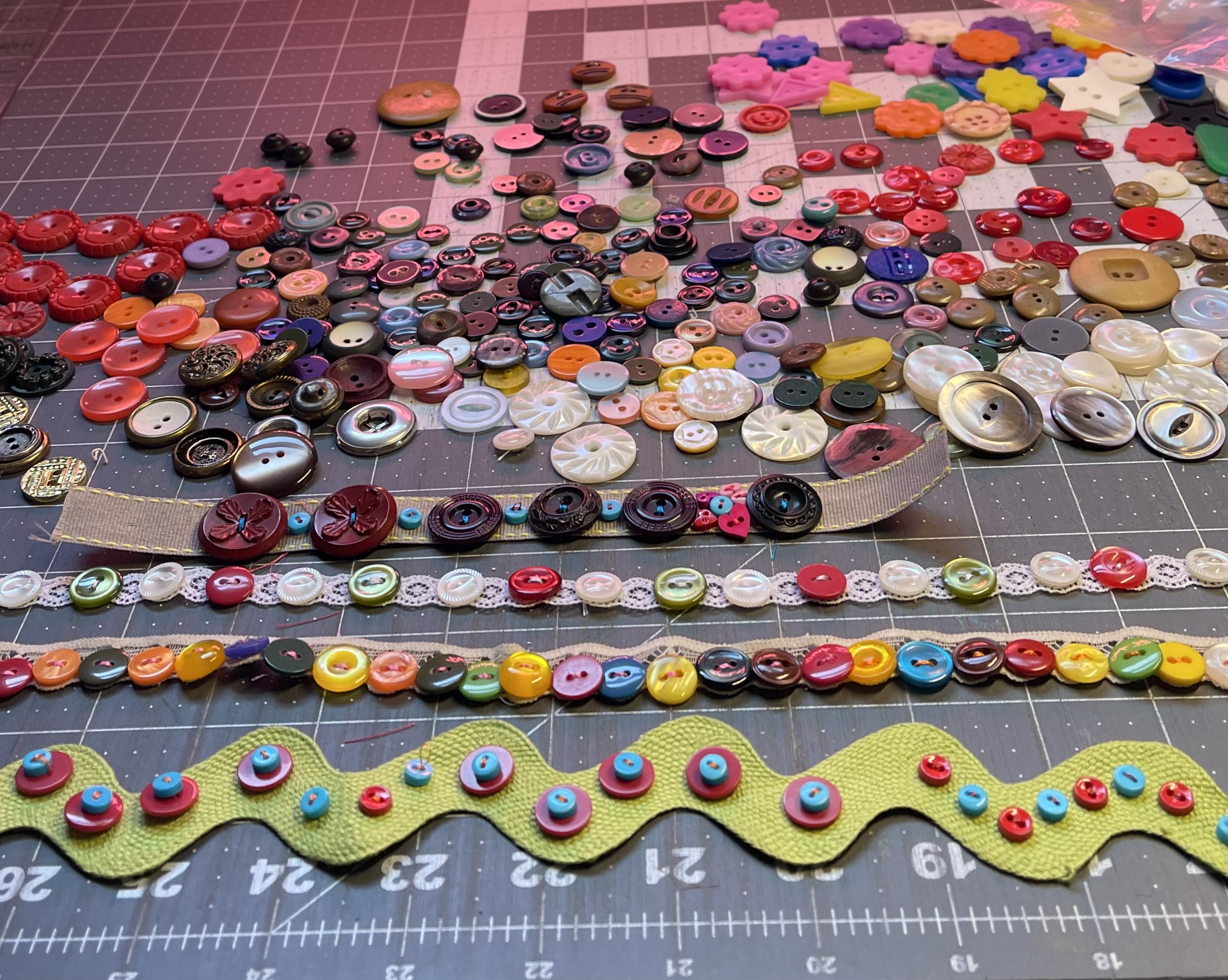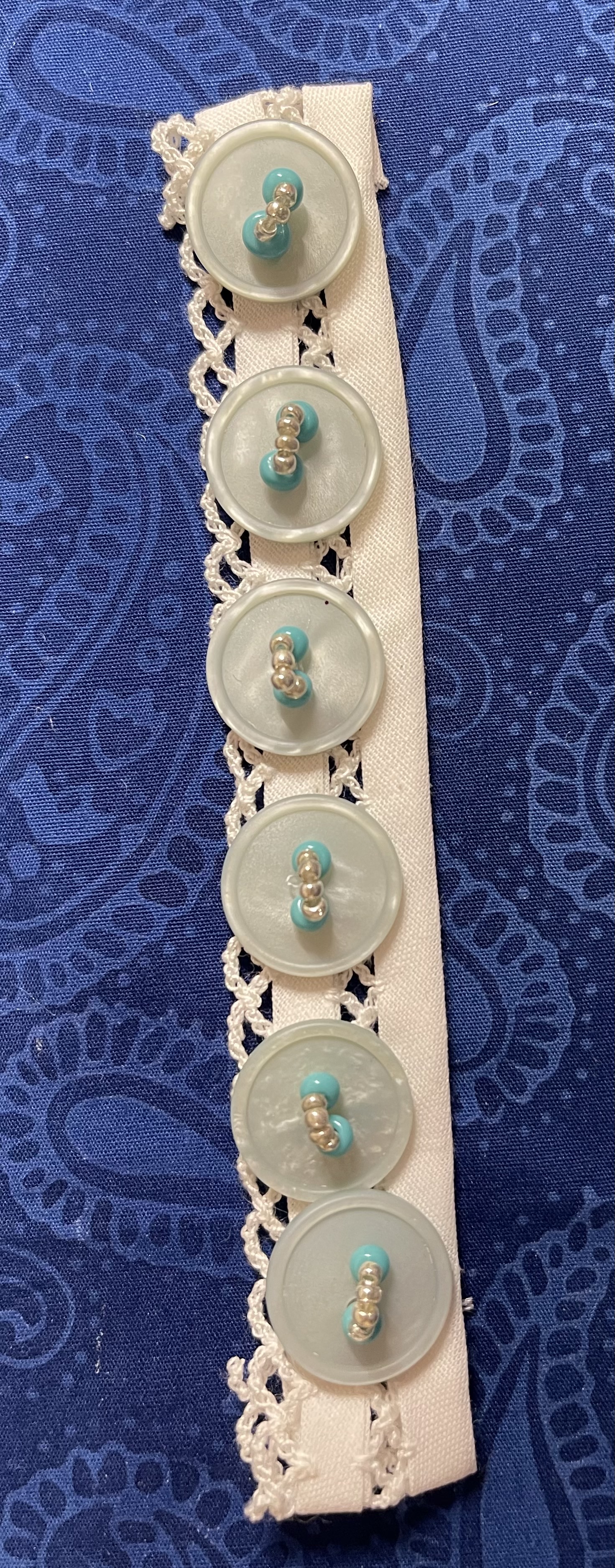 When the quilt went to the longarmer, I wanted to start working on the embellishments, so I went ahead and started sewing buttons and beads to strips of vintage ribbon and lace. This task was preceded by lots of button box searches (and reorganizing of button boxes) for two-hole buttons which would definitely speed up the process for me!