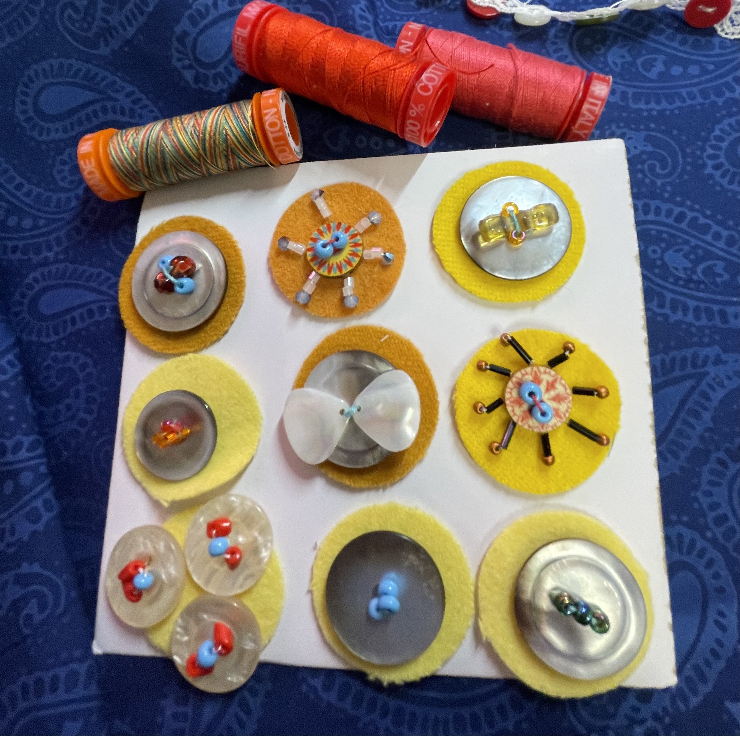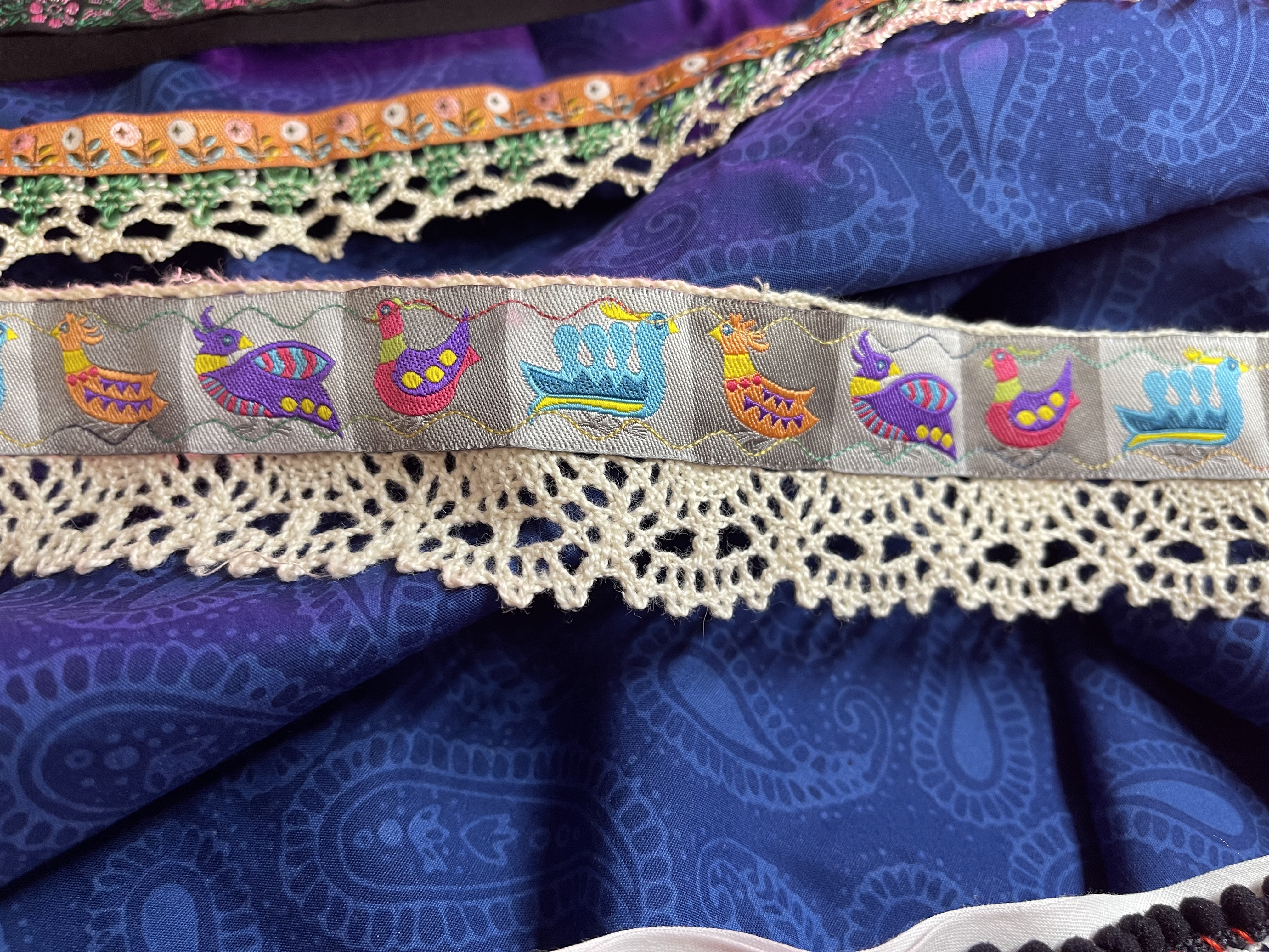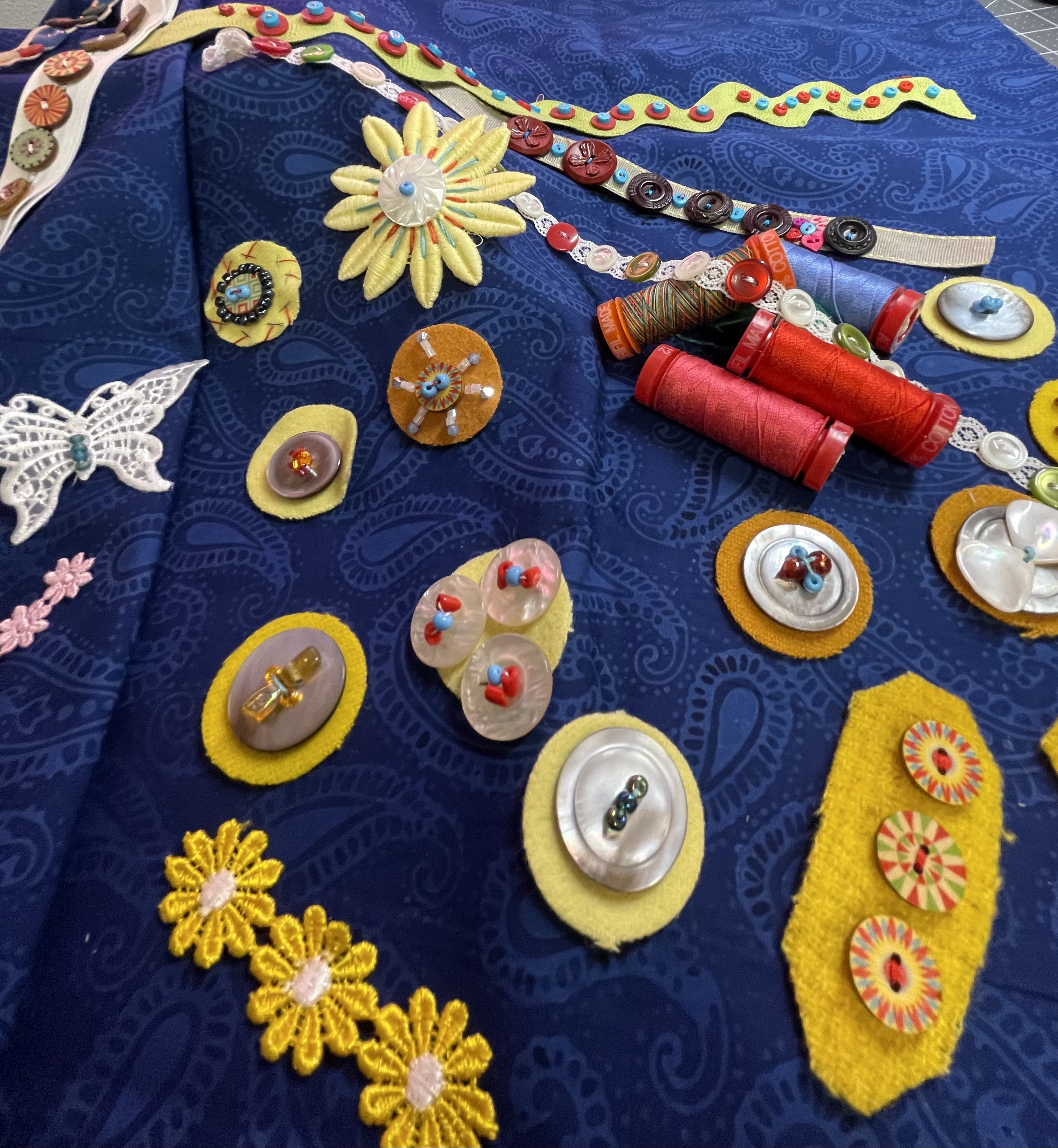 The trim and ribbon storage also was searched which led to the discovery of Jane Sassaman ribbons with one that matched perfectly to the folk-art tinamou bird mentioned earlier! That was a fun find! A 3-inch vintage yellow daisy trim were snipped apart and with individual daisies festooned with beads and thread.