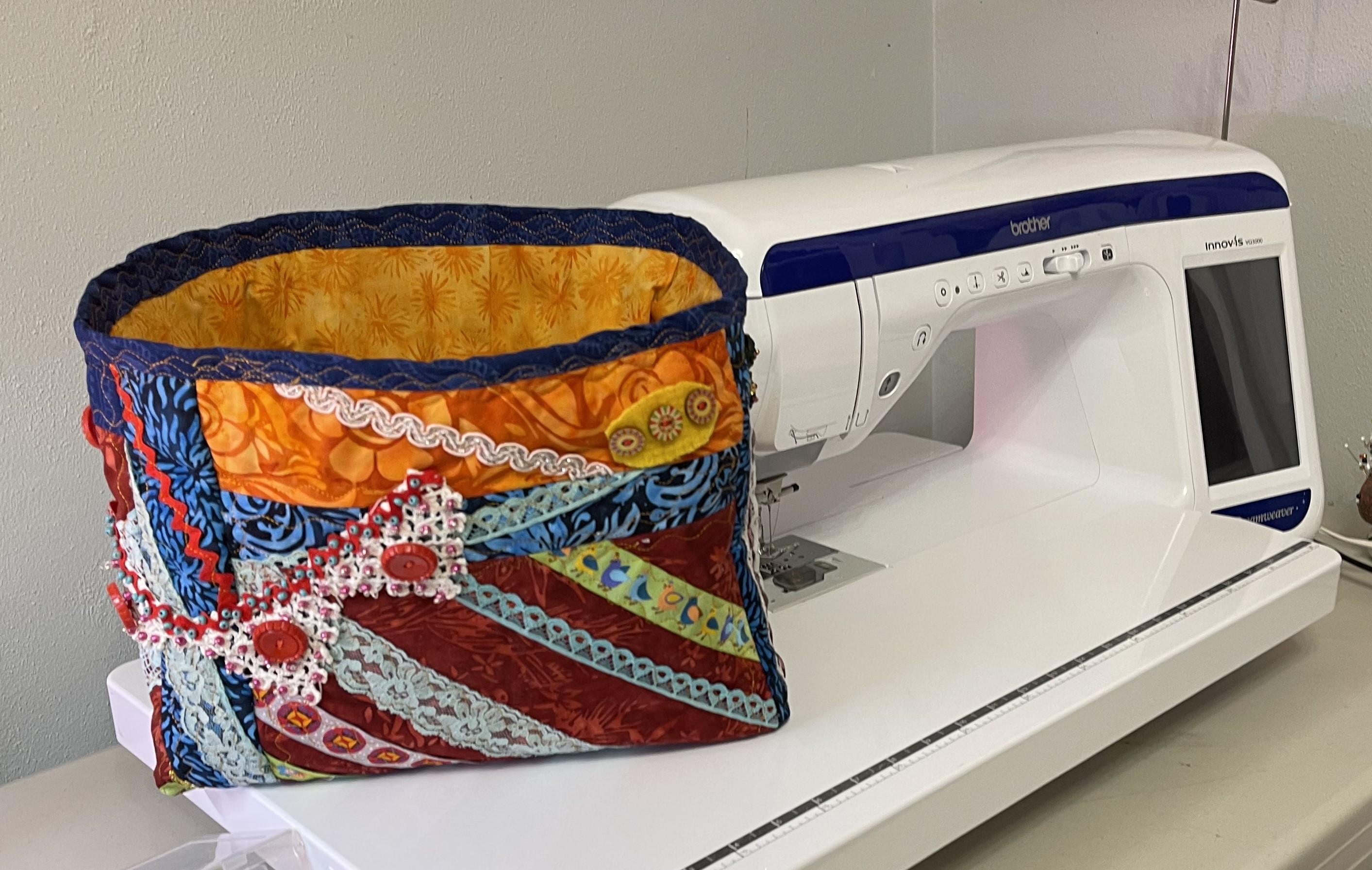 Of course, I cannot leave scraps behind, so I created a rectangle fabric box; embellishing with left over lace, trim and a few of the items I determined too delicate to use in a large quilt.